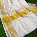 Off-white with multicolor floral embroidery and golden kasavu border.