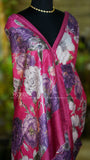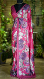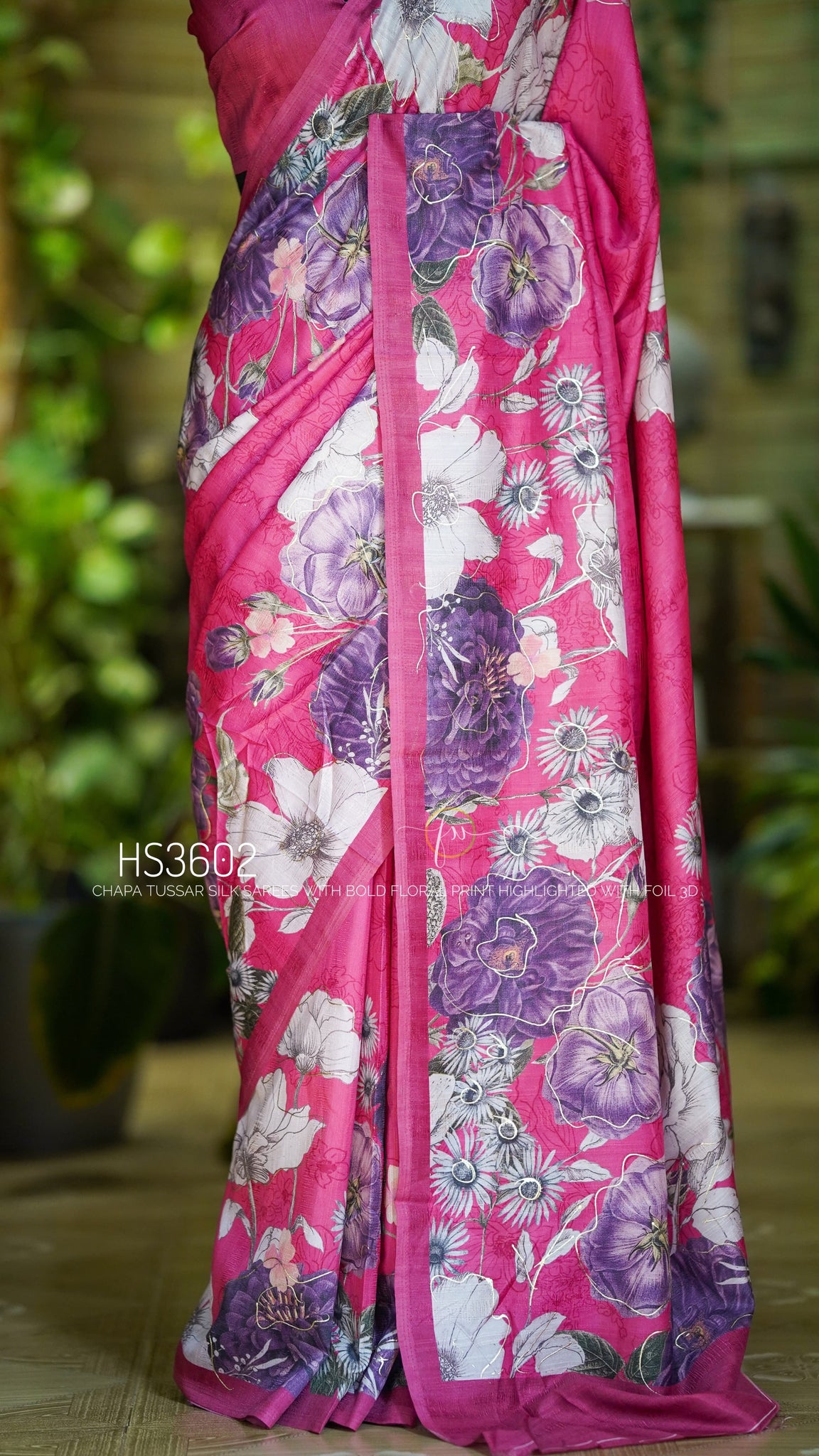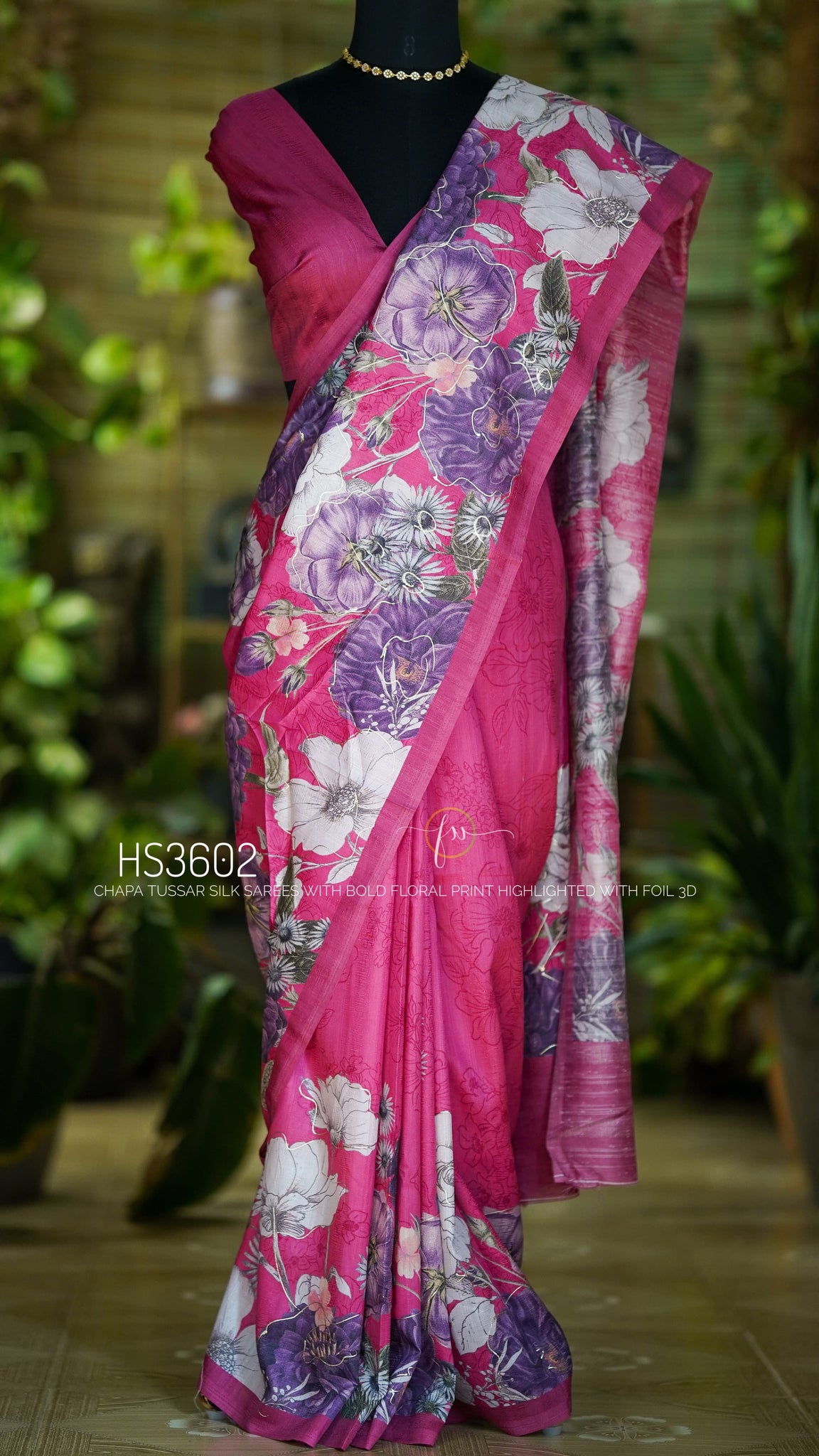 Imagine being enveloped by the sweet innocence of a rose garden, where bold florals bloom with passion. Our Chapa Tussar Silk Saree, with its vibrant digital print on rose pink, is a gentle hug that makes you feel cherished. The foil highlights shimmer like tender kisses, leaving you feeling beautiful and beloved.