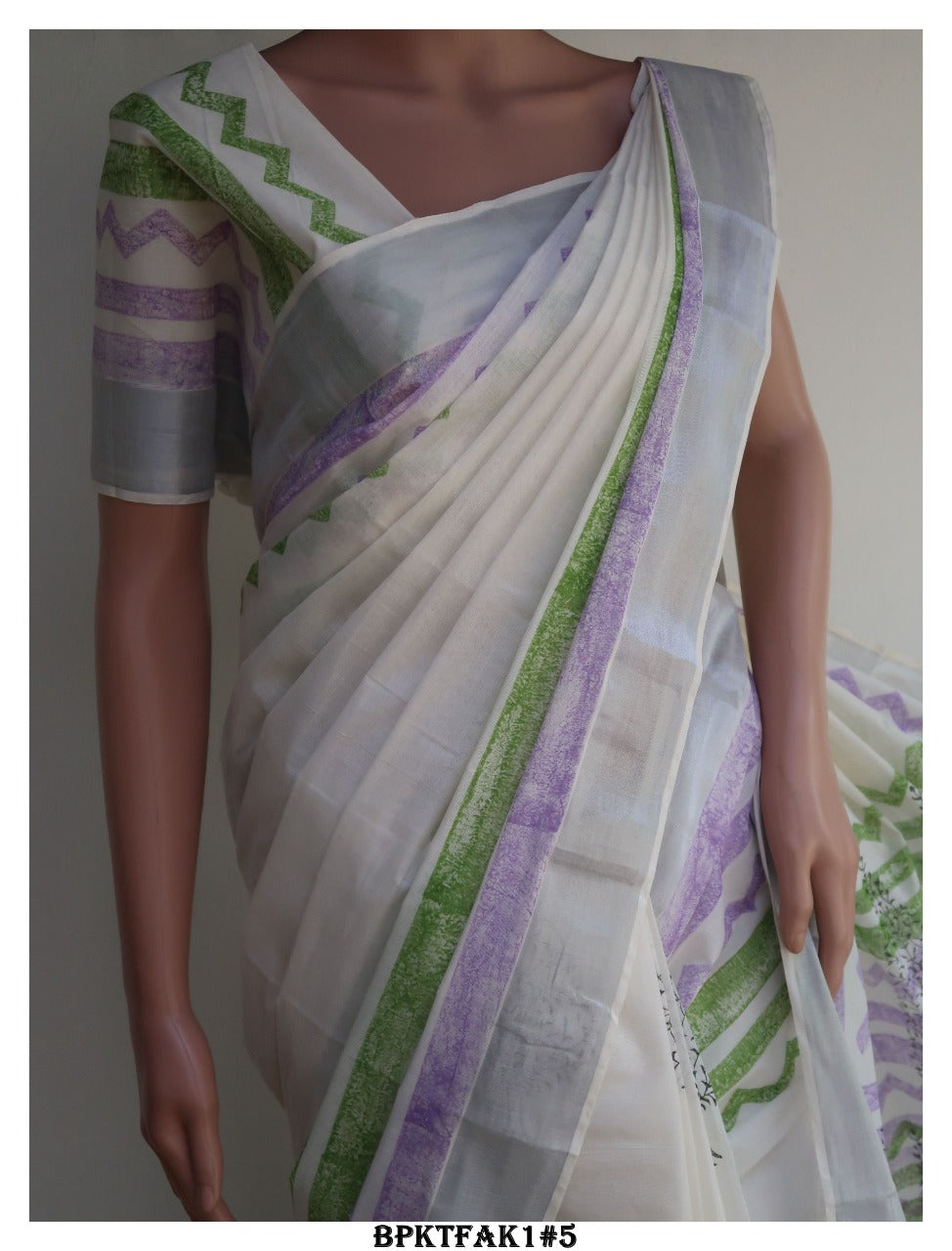 Hand Block Printed Kerala Cotton Saree with Blouse Piece