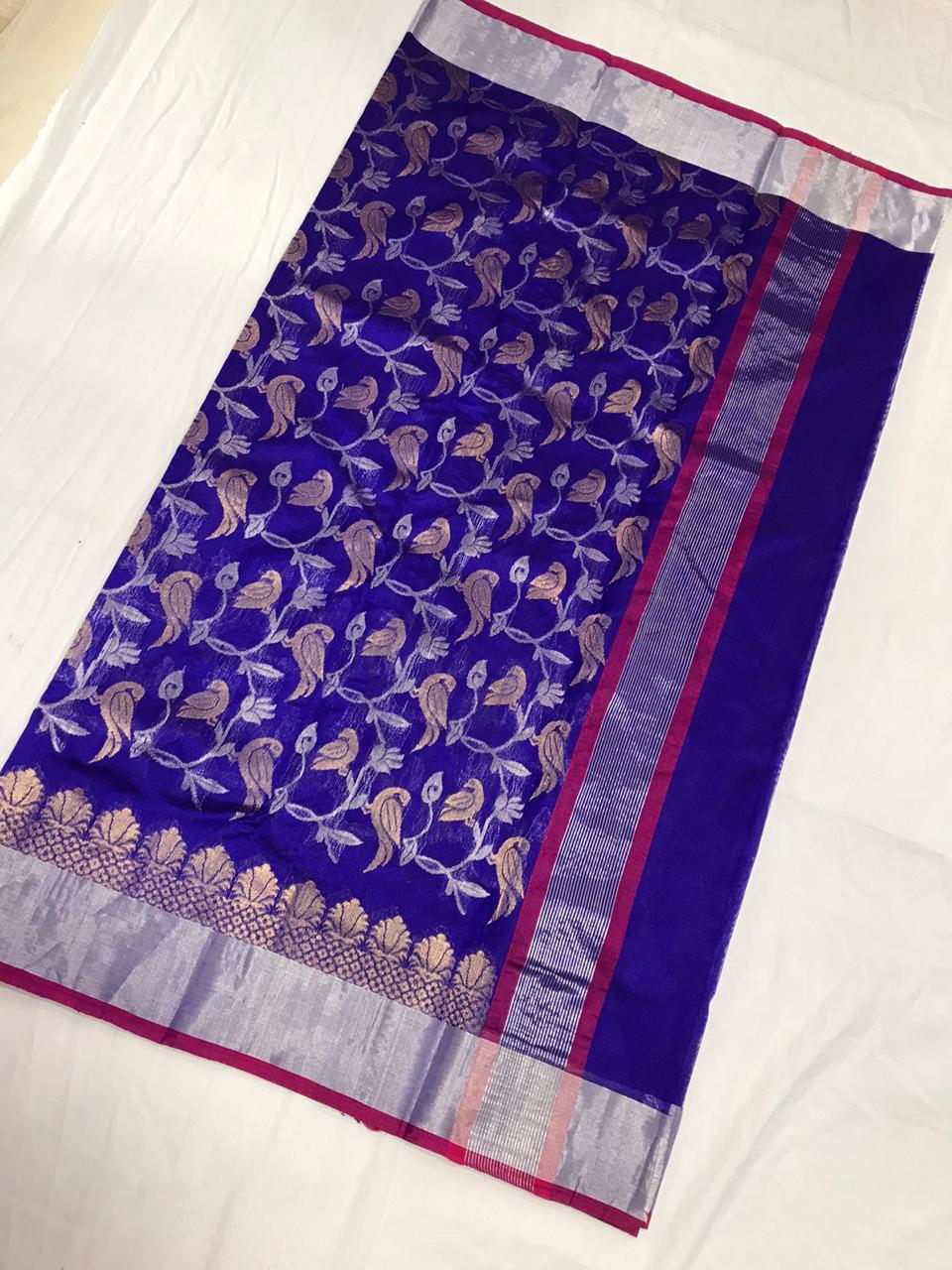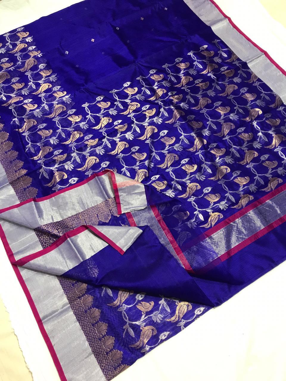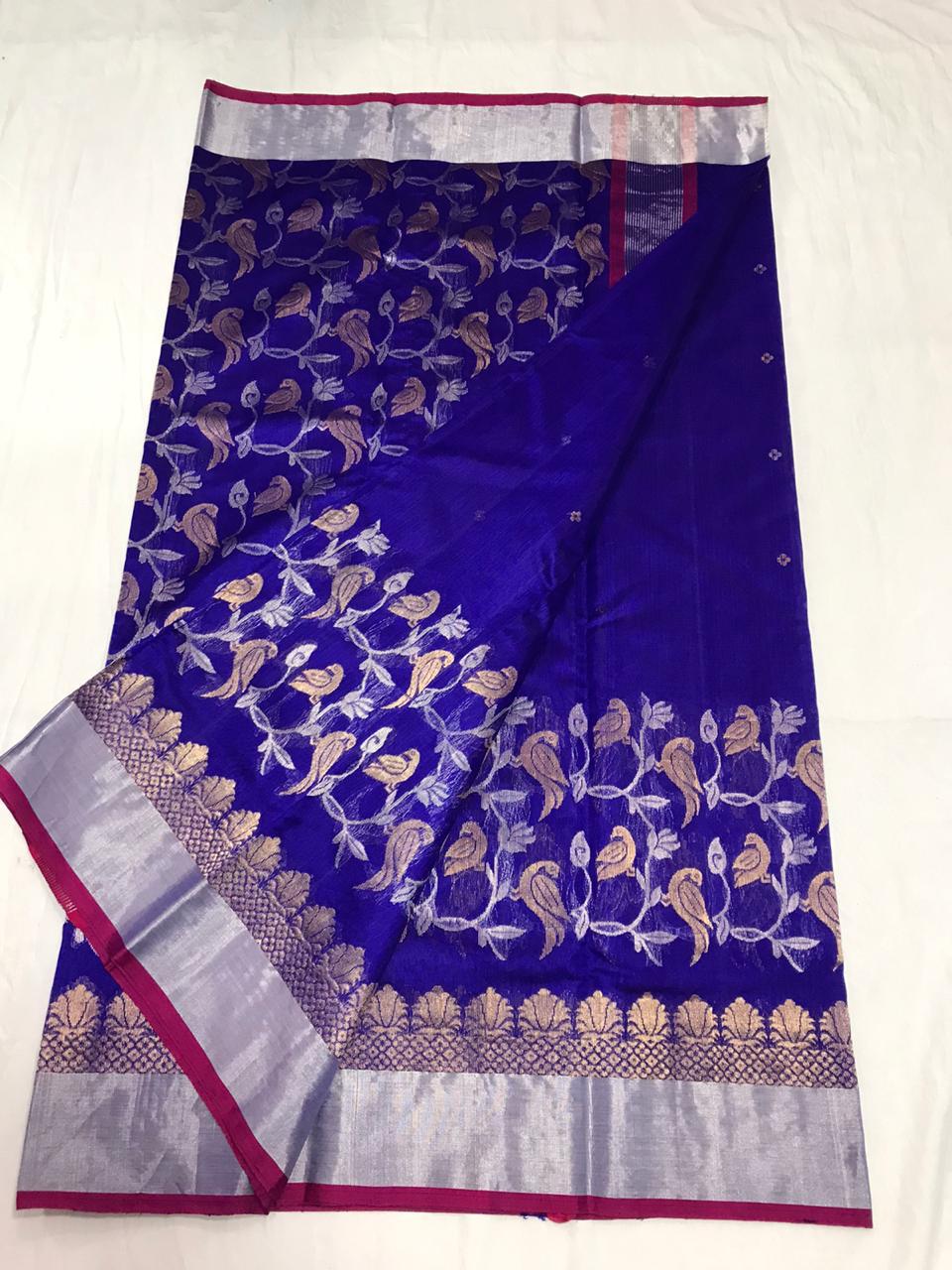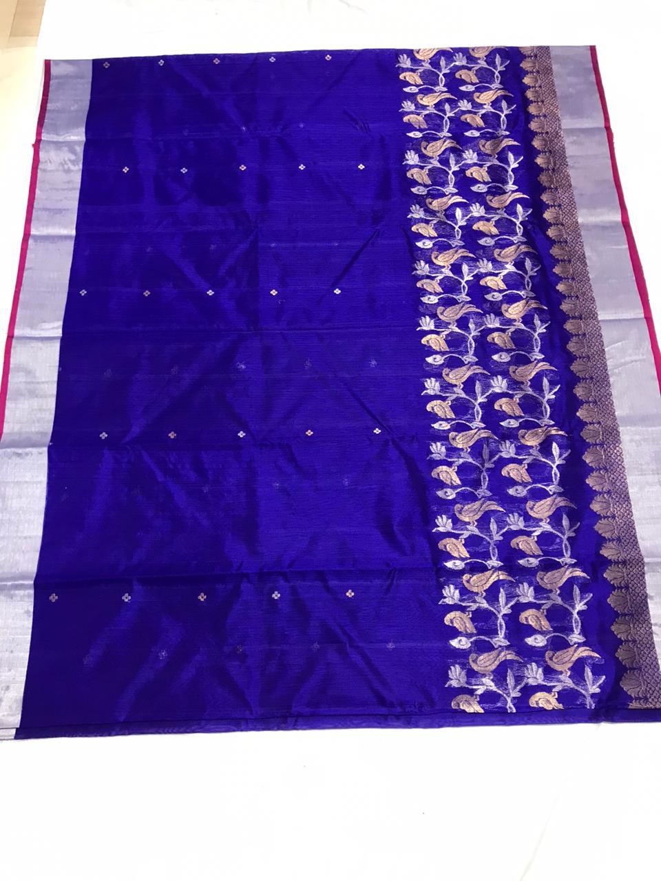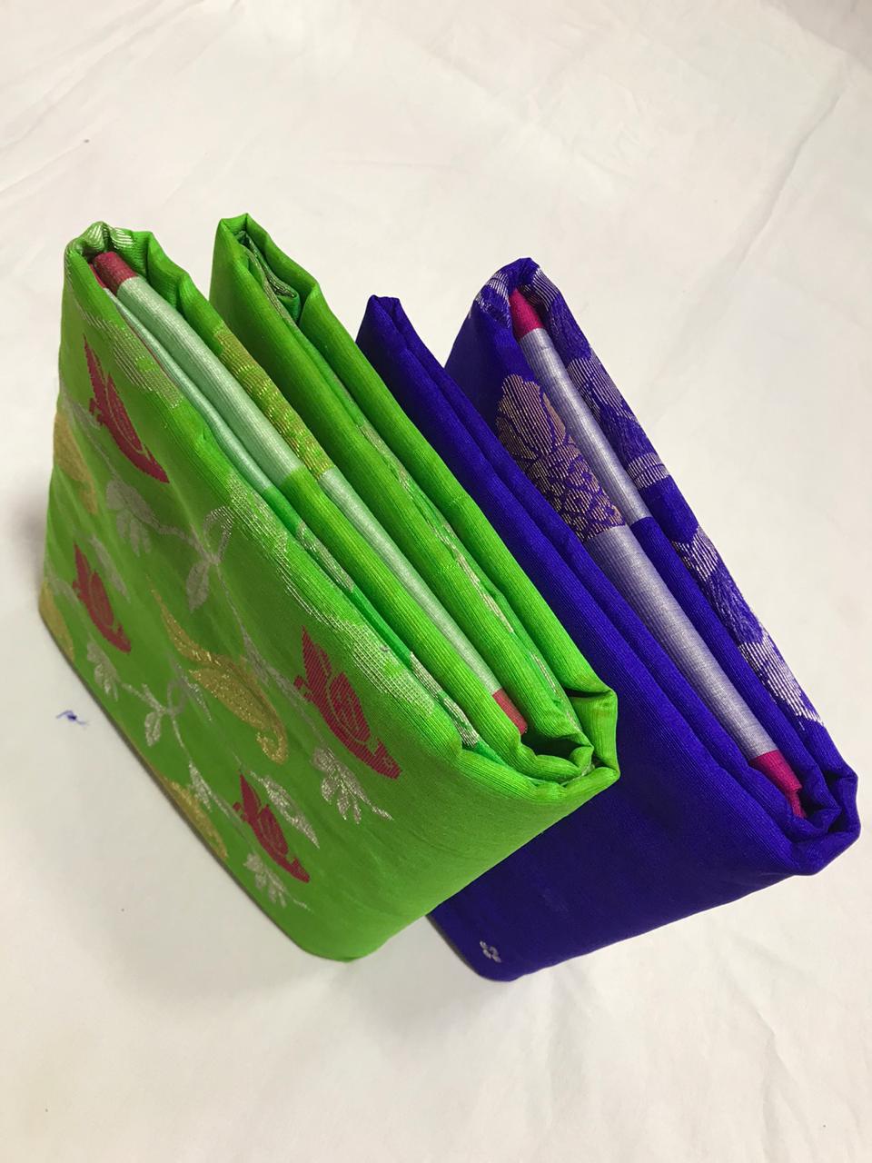 Chanderi Silk Cotton Saree with Polka Dots available in Indigo Blue and Parrot Green shades.