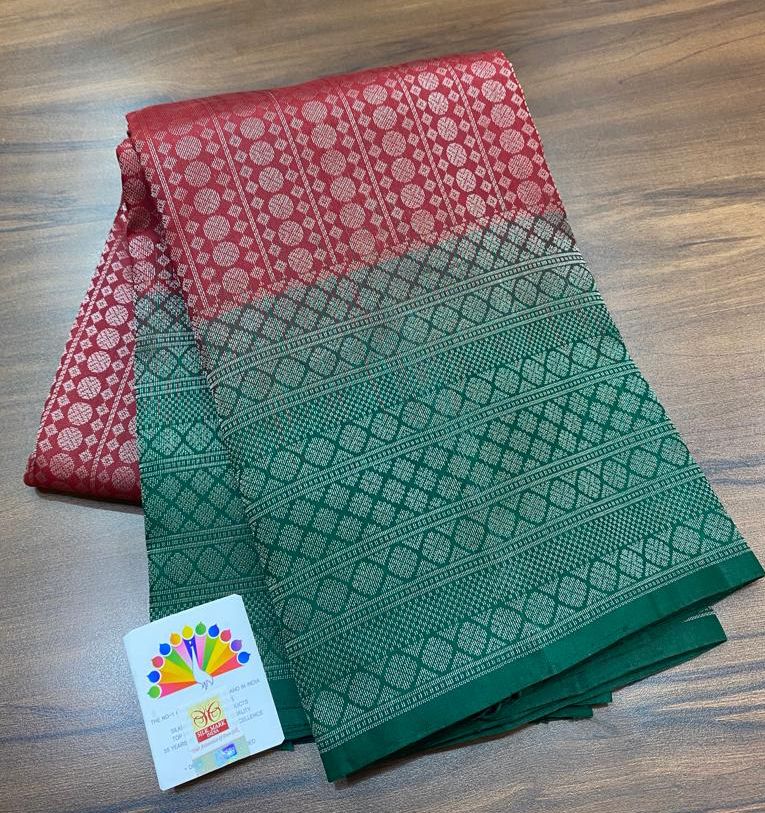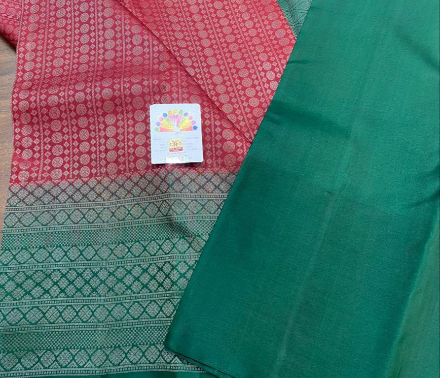 GREEN AND MAROON COMBINATION PURE KANCHI HANDLOOM SOFT SILK SAREE WITH ALLURING RICH PALLU- CUTE MOTIFS ALLOVER AND BLOUSE