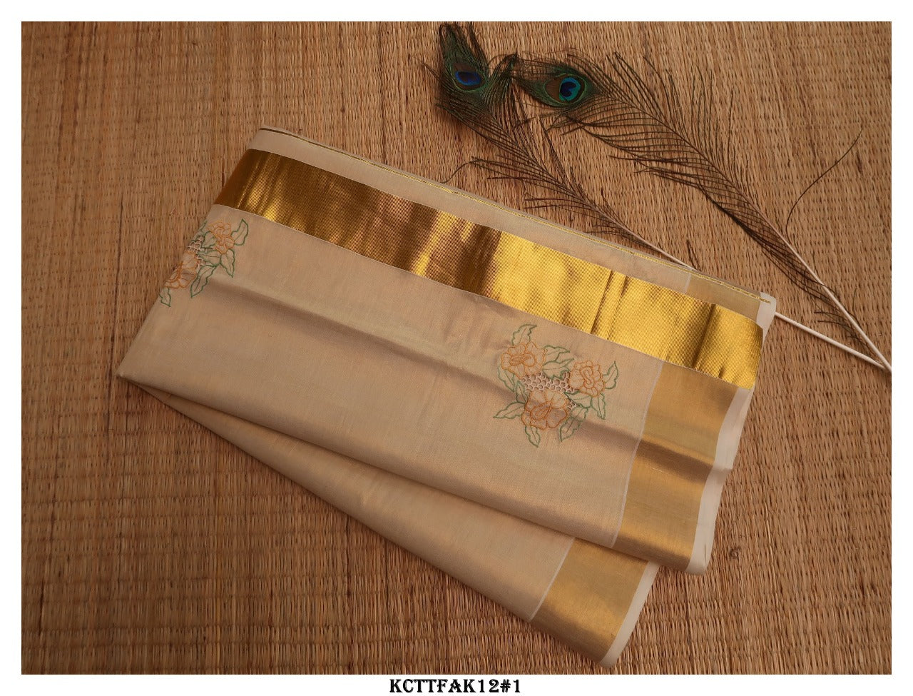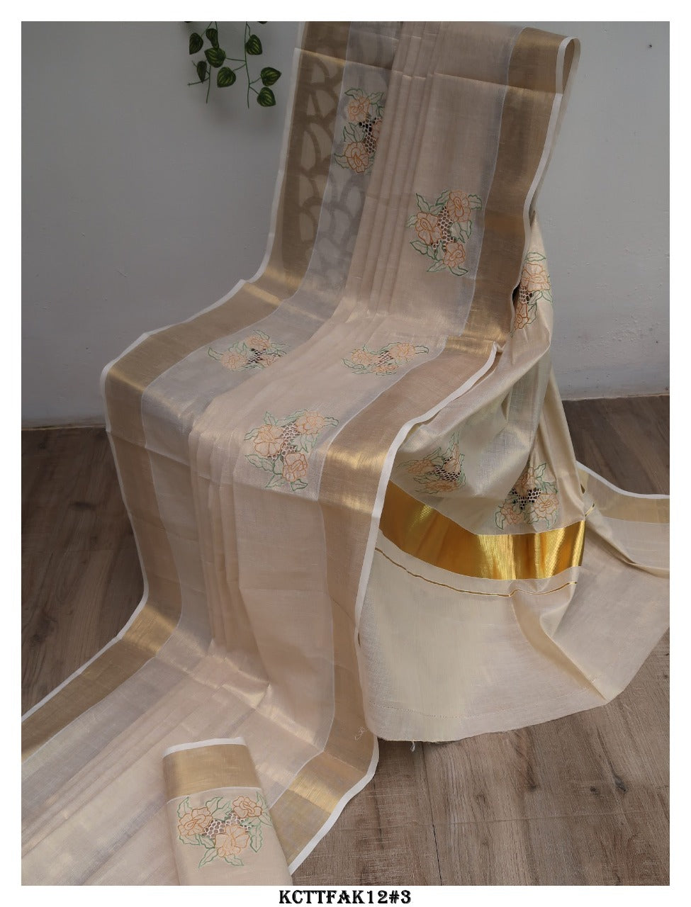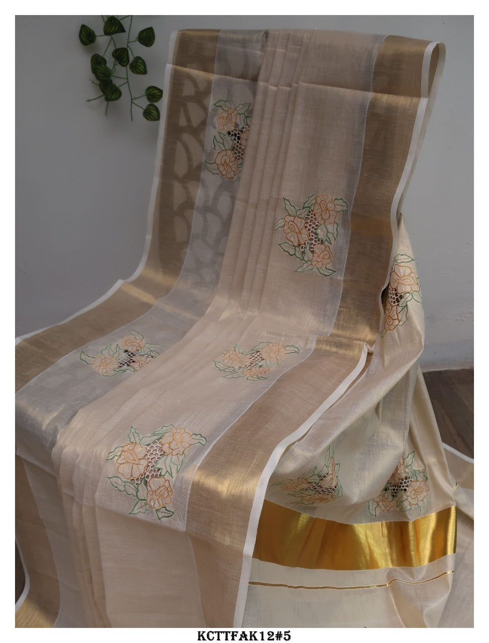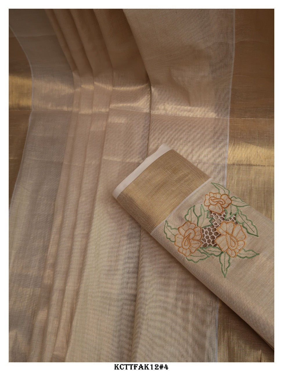 Cutwork Floral Motifs on Kerala Cotton Tissue Saree with Blouse-KIA001CW