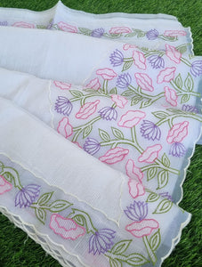 Beautiful white Kota saree with organza border featuring perfect finish applique work. Delicately embroidered in pastel pink and lavender floral motifs with green leaves. The fine applique on the organza border gives it an elegant, premium look—perfect for summer or festive occasions.
