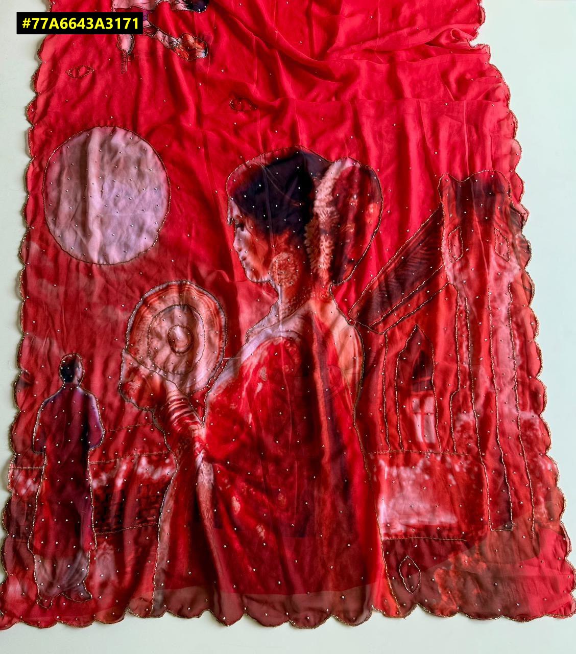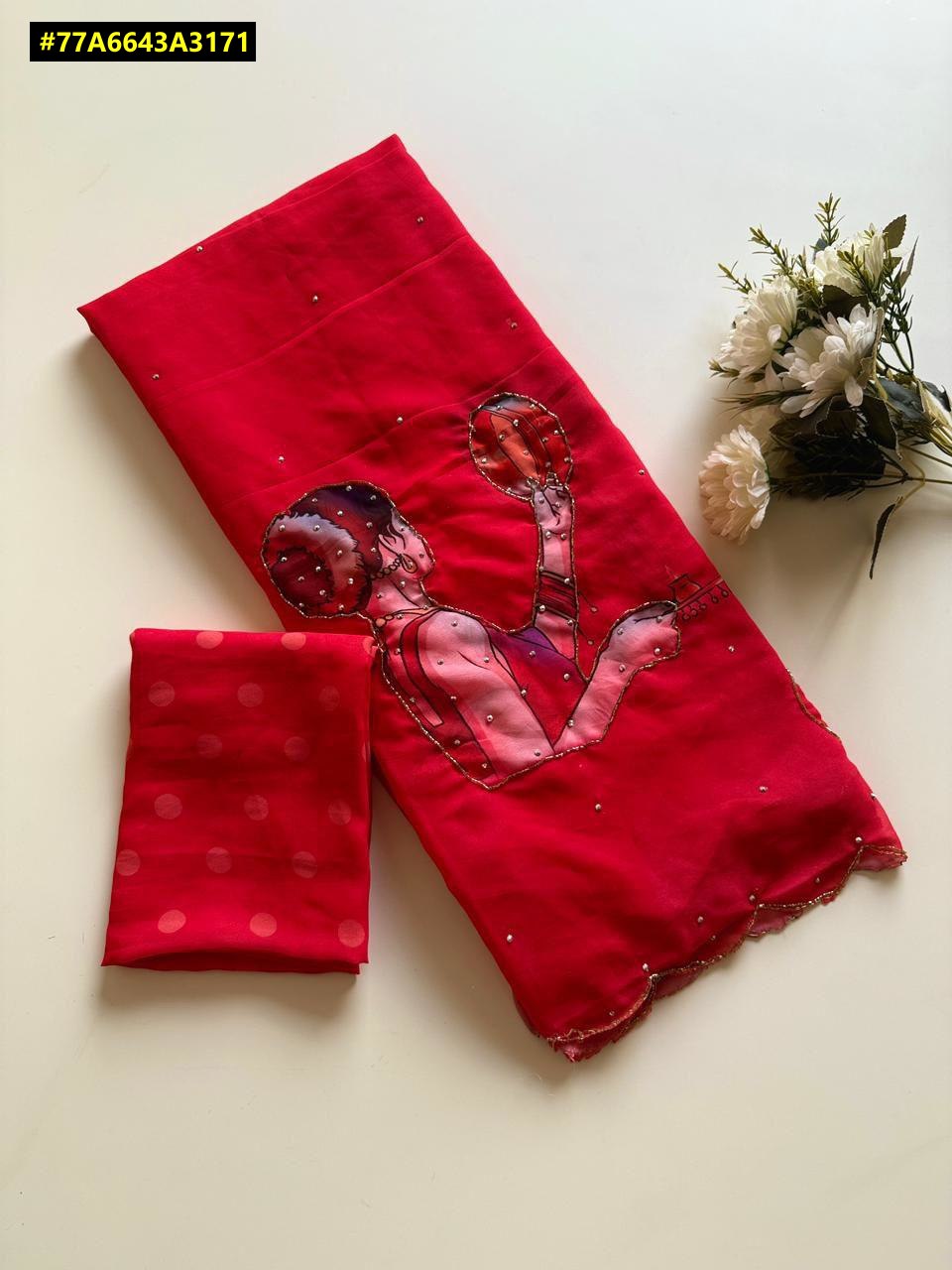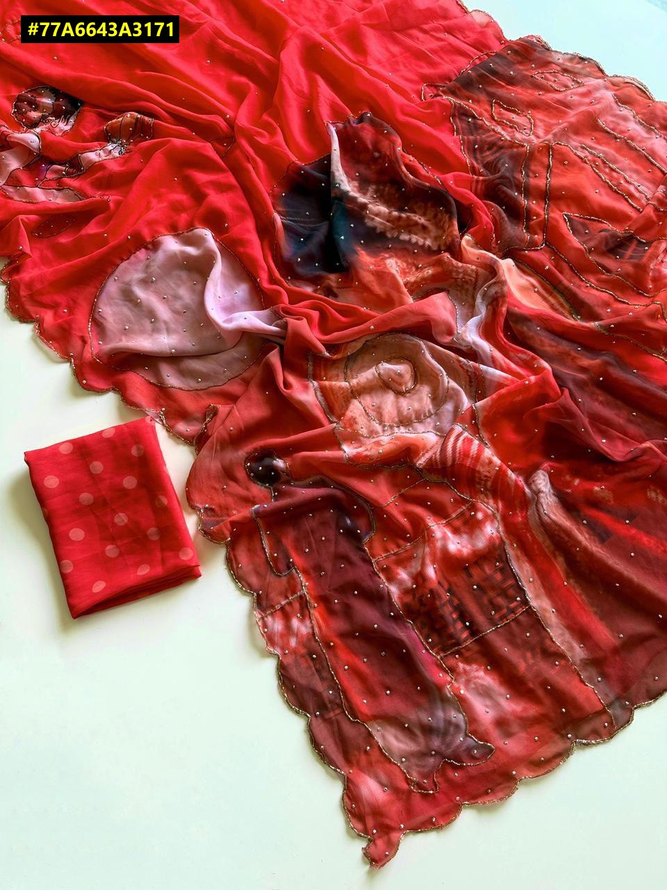 Fabric - Soft Weightless Fabric Beautiful Karva Chauth Digital Print With Cutdana Handwork And Stone Work In All Over Body And Cutwork Border With Running Printed Blouse