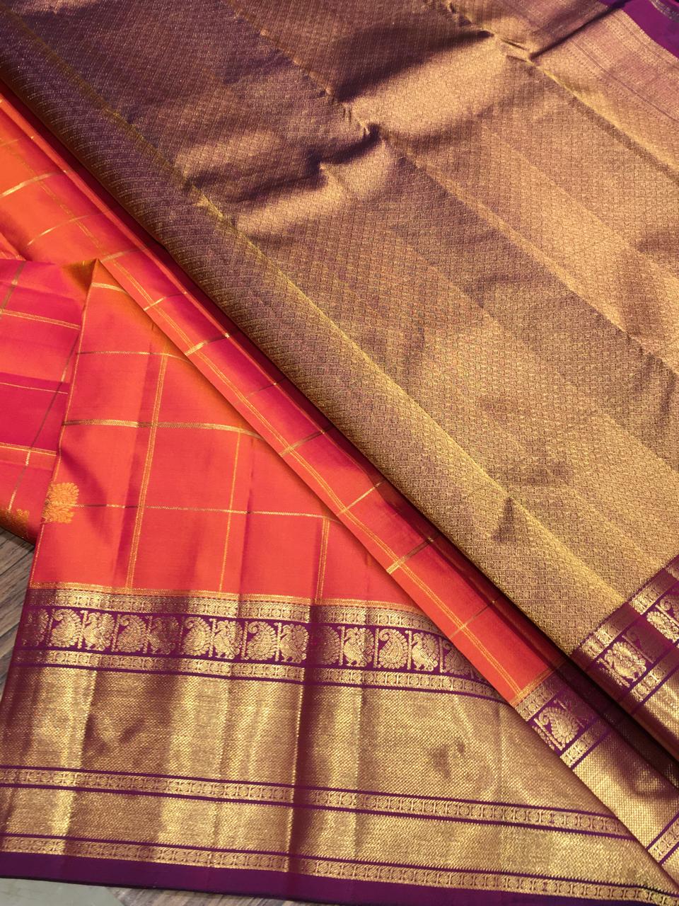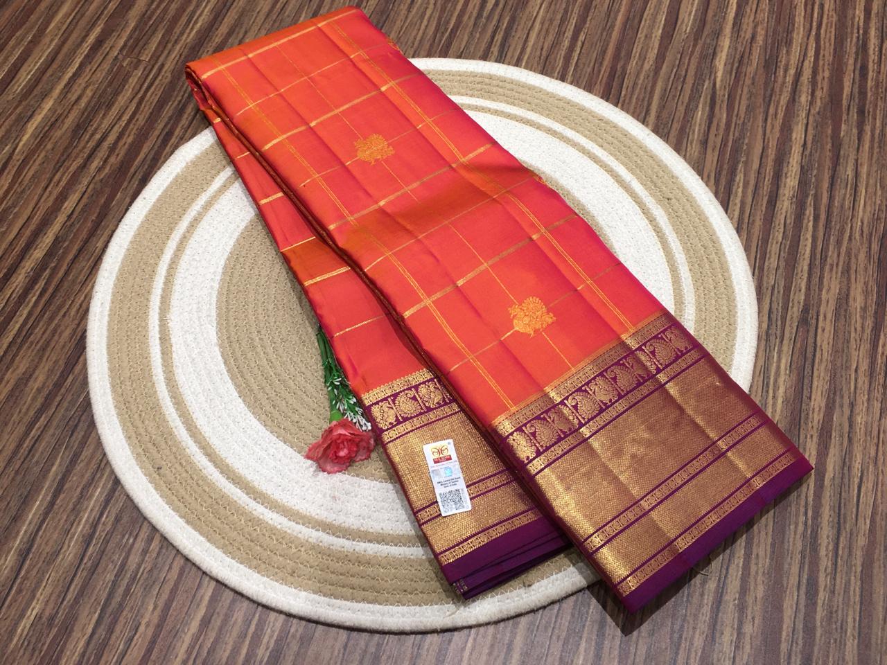 Madhubala , Orange shade Golden Checks elegant Kanjeevaram Silk Saree for women -SACHI001OS
