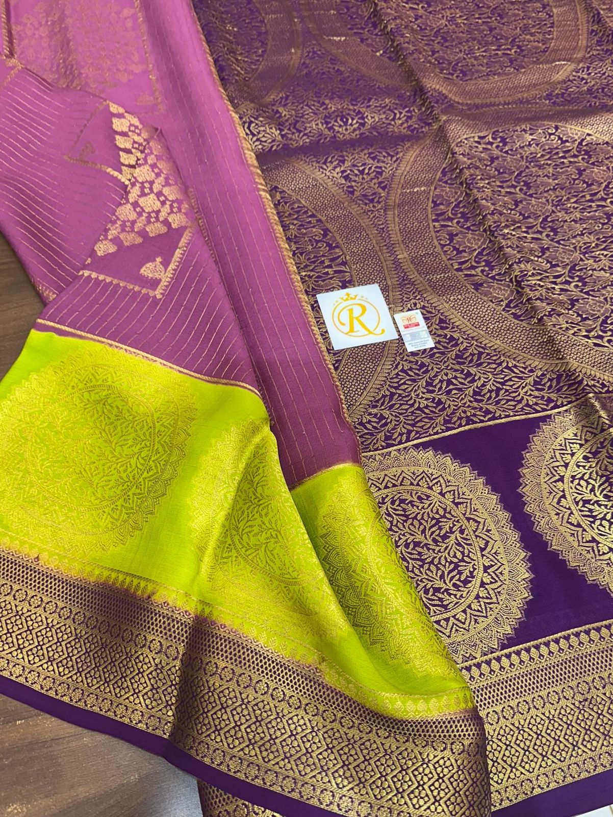 Padmavathy showcases premium Mysore crepe silk elevated by a substantial 140 GSM weight, delivering superior body and a graceful fall. The fabric demonstrates exceptional weaving precision with intricate patterns woven throughout, while the opulent pallu features elaborate embellishments that command attention.The heavier silk composition provides enhanced durability and a luxurious tactile experience, making it an investment piece for discerning connoisseurs. Ideal for significant celebrations, formal gatherings, and occasions demanding understated sophistication and timeless appeal.