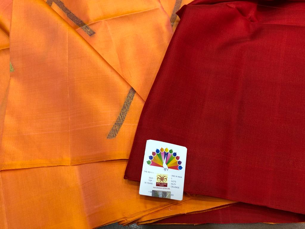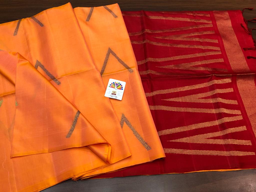 PEACH AND MAROON COMBINATION PURE KANCHI HANDLOOM SOFT SILK SAREE WITH ALLURING RICH PALLU- CUTE MOTIFS ALLOVER AND BLOUSE