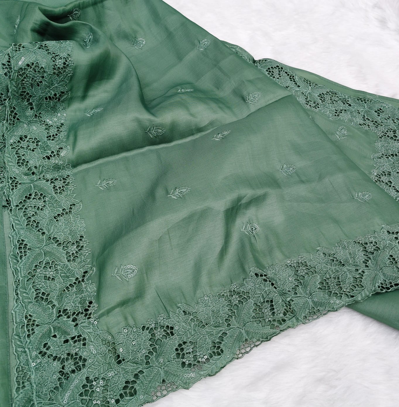 Graceful semi Tussar saree in a soothing sage green shade, highlighted with exquisite cutwork embroidery on the borders and delicate embroidered motifs across the body. Soft, lightweight, and elegant, this saree is perfect for festive occasions, day functions, and refined ethnic wear.