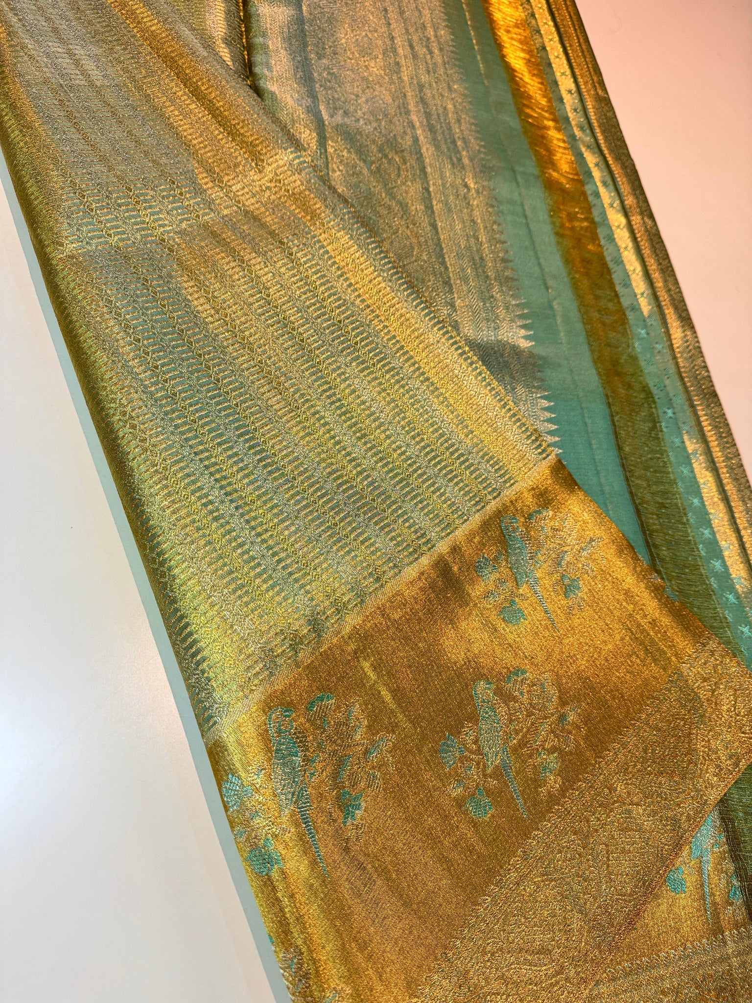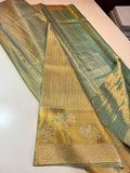 Elevate your saree game with this Pure Silk Gold saree featuring exquisite gold and silver striped weaving and a stunning hand-embroidered meenakari border. Made with premium quality handloom silk, this designer Kanchipattu saree is a must-have for any special occasion. Get ready to make a statement with Sougandika !