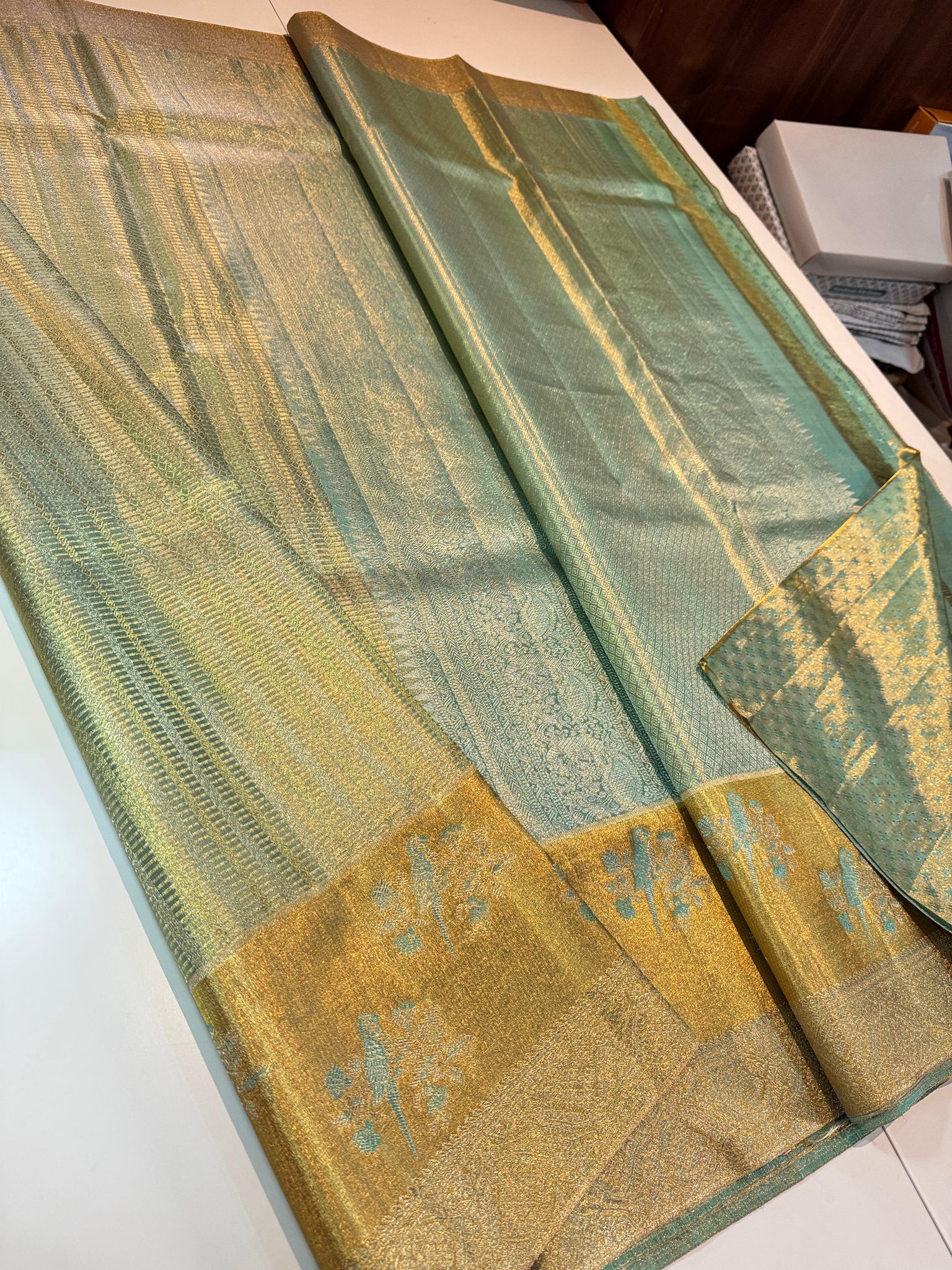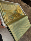 Sougandika , Pure Silk Gold By Gold Silver Stripes Weaving Edge To Edge Border Meenakari Exclusive Premium Designer Kanchipattu Handloom Saree -SACHI001GS