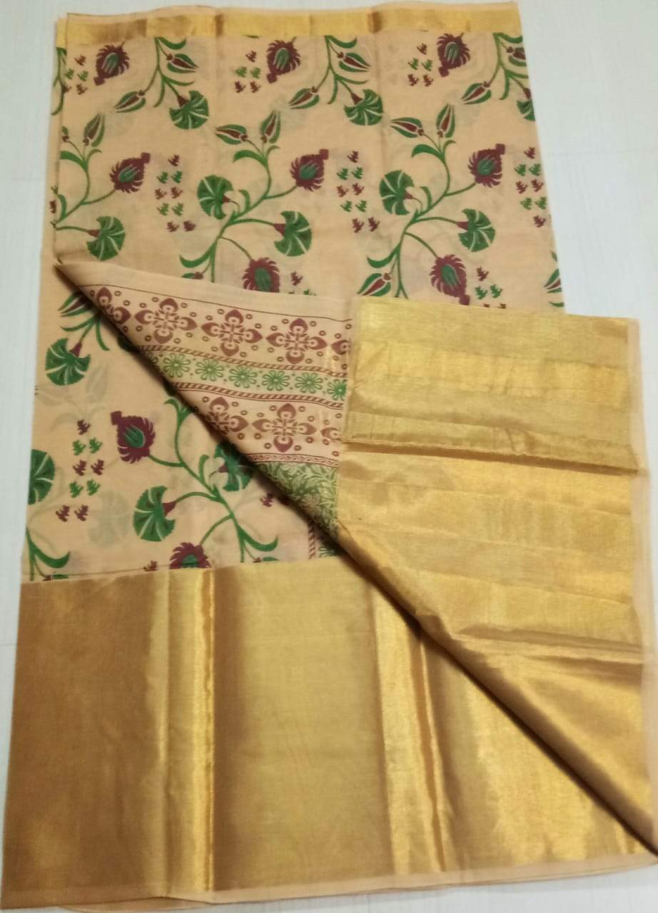Uppada Cotton Saree with floral digital print and heavy large gold Zari Border on one side