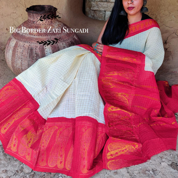 Exclusive Madurai long (9inch) Big traditional Border Sungudi Zari Kattam Saree