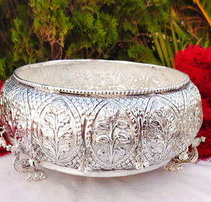 1. Antique German silver pure silver finish Urli with hanging Ghungru