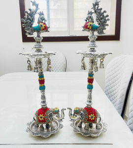 Exclusive German silver hand engraved big peacock samai/diya with Elephant base and plate to light up diyas DECO001SP