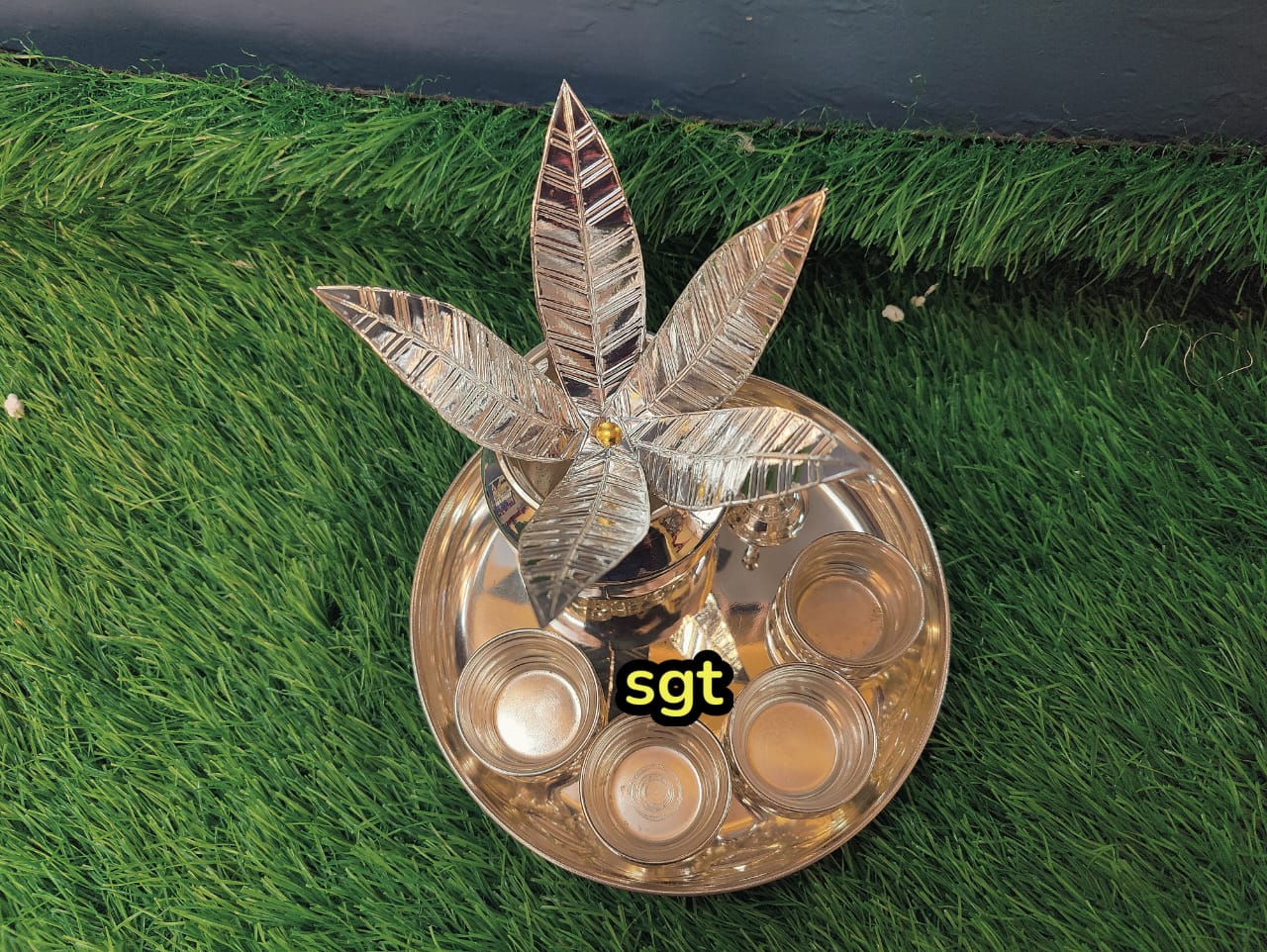 Full set German Silver washable Plate with Kalsha , Mango Leaves ,Bell and Kumkum Bowls-SILVI001CA