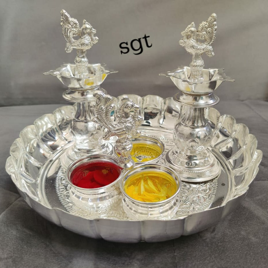GAYATRI, GERMAN SILVER FLOWER CUT DESIGN PLATE WITH PANCHWALA AND DEEPAM-SNSS001
