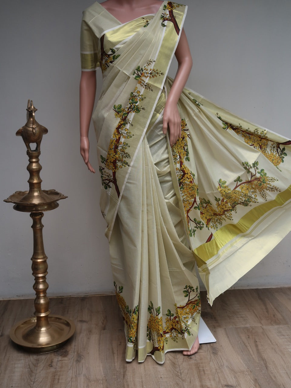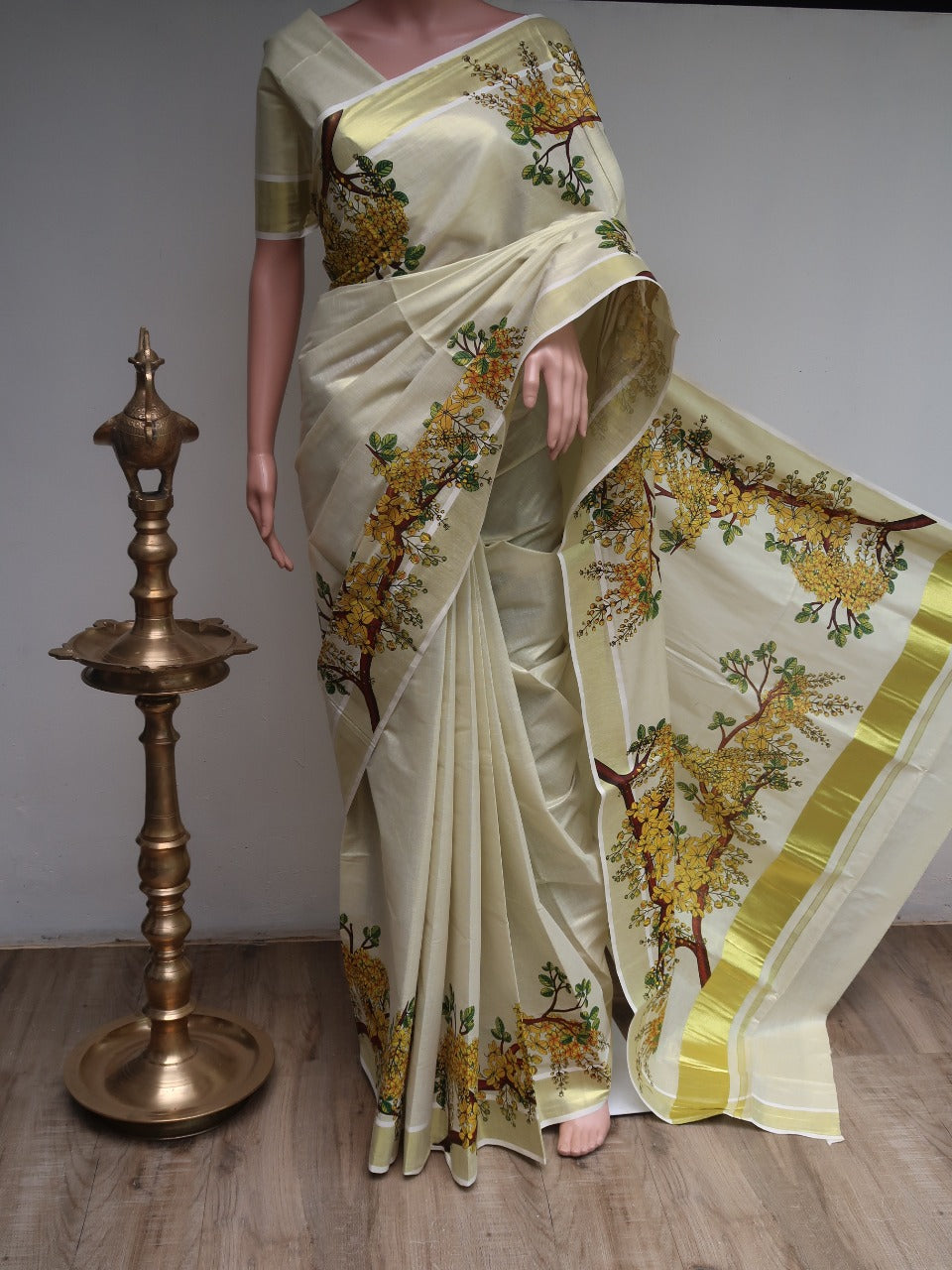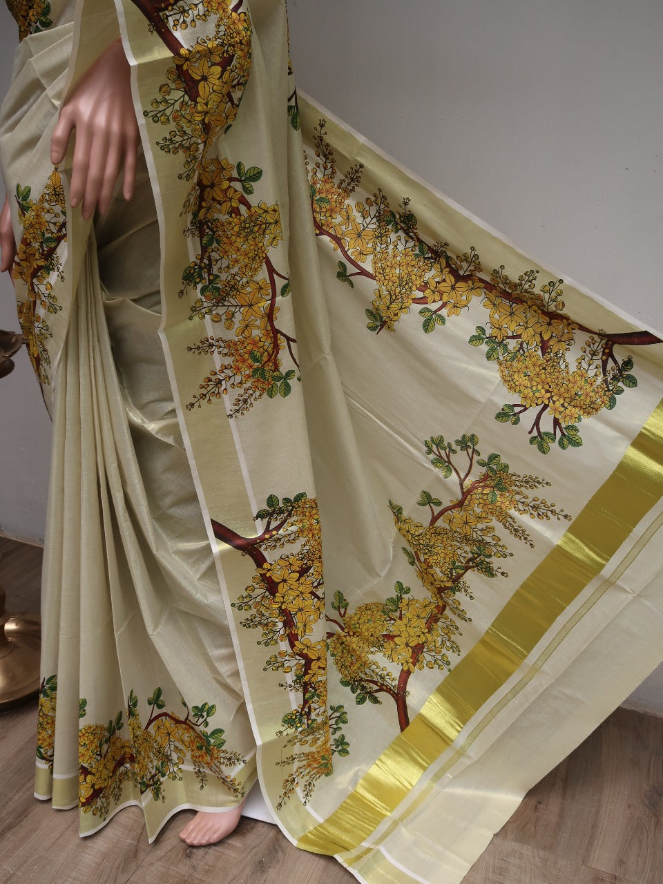 Floral Prints on Kerala Cotton Tissue Sarees with Blouse