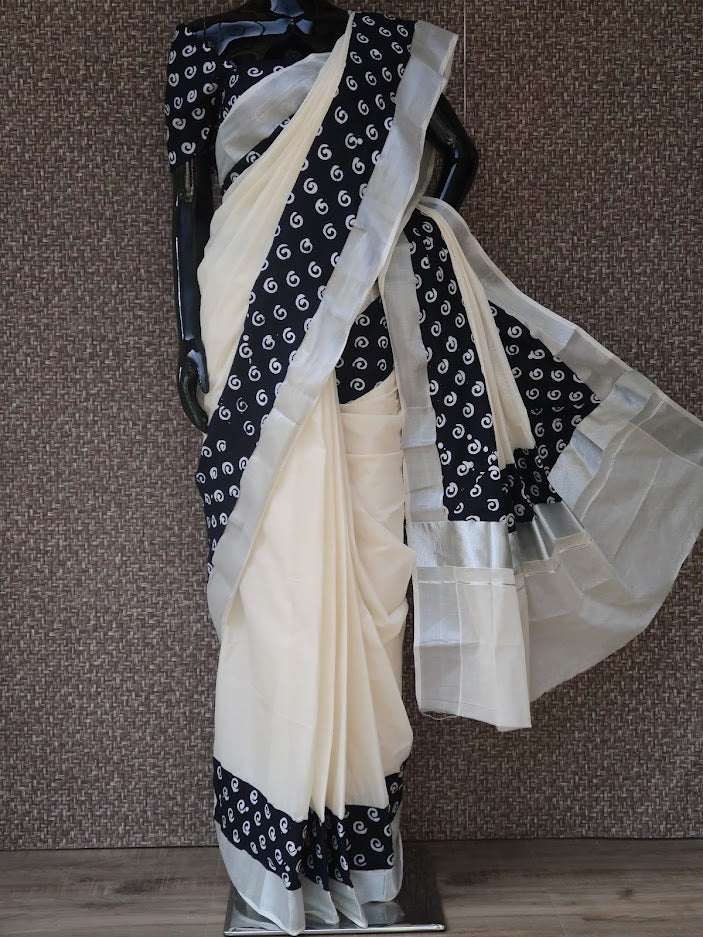 AMRUTHA , ELEGANT HAND BLOCK PRINTED KERALA COTTON SAREE WITH GOLD ZARI -KIA001AT