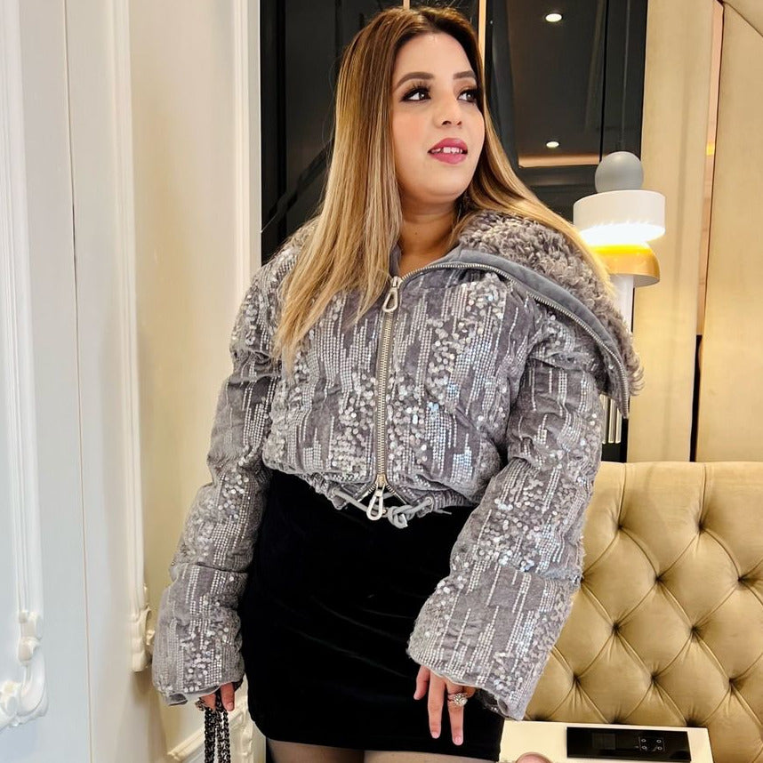 Grey Heavy Sequins Jacket with Warm Fur Collar for Winter-SHIVAY001BFJG