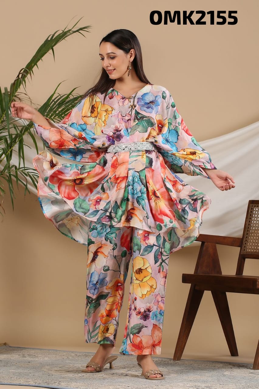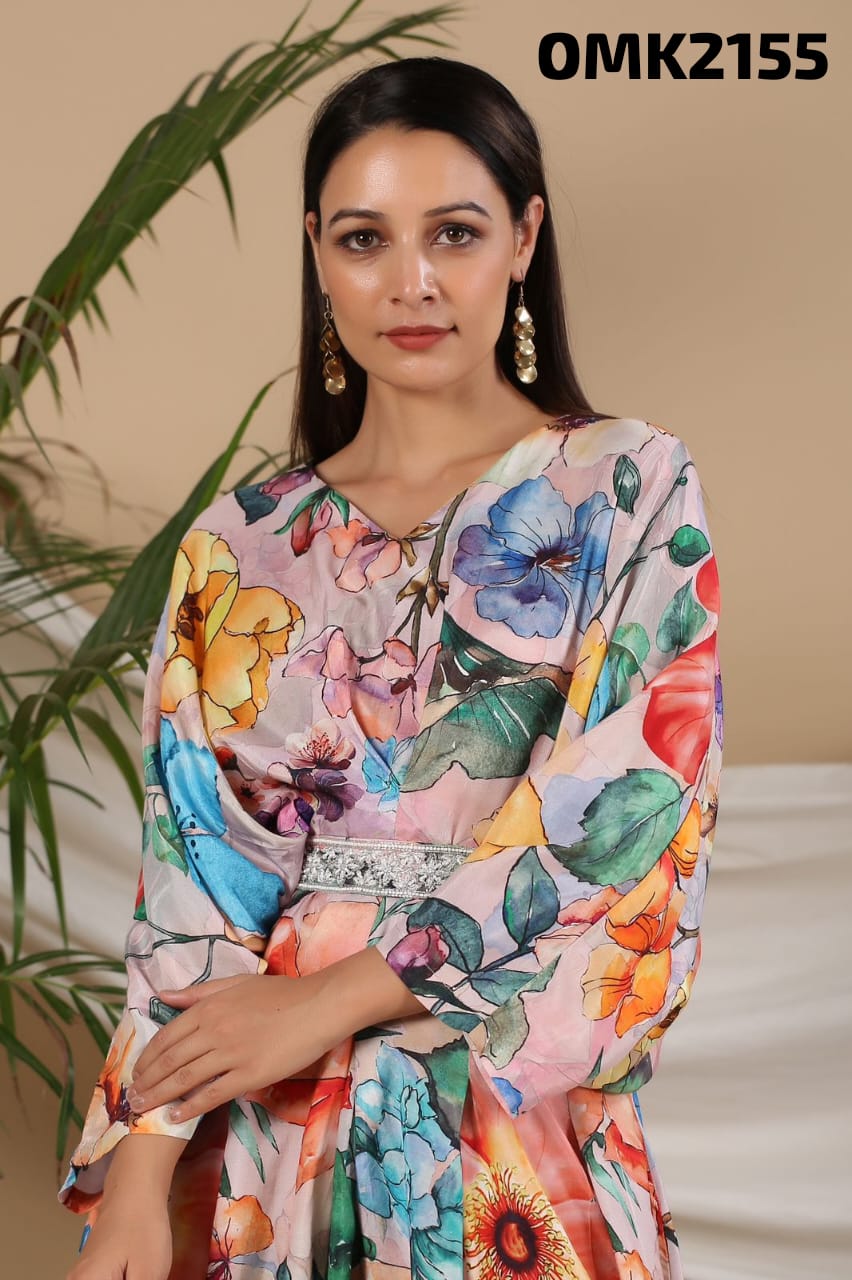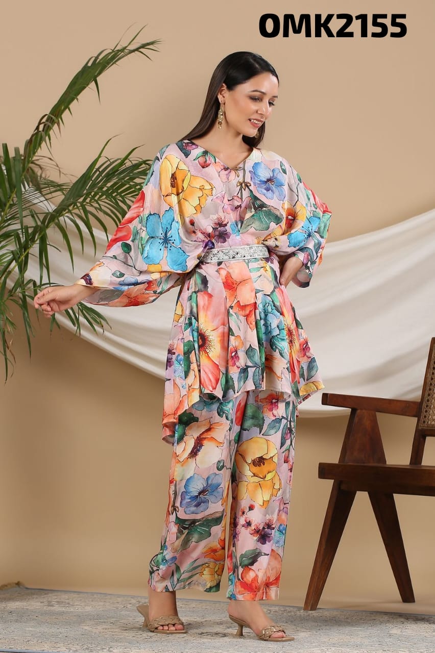 Beautiful Designer Digital Print Pure Muslin Two Piece Co-ord Set With Palazo Style Bottom & Complimentary Belt-FOF001CS