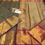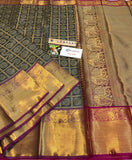 Black and purple tussar and cotton mix saree with golden zari and weaved golden elephant patterns and rich gold pallu