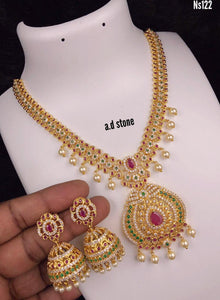 Bridal Necklaces Set with American Diamonds, rubies and Pearls with a matching stones Jumka.