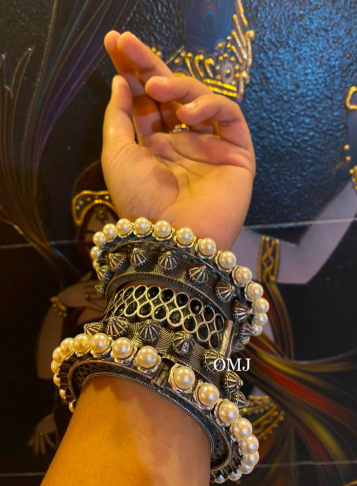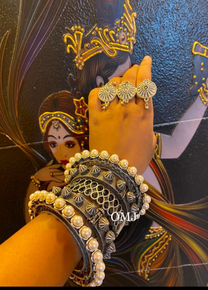 IRAVATHY , ELEGANT OXIDISED SILVER FINISH BANGLE SET WITH RING FOR WOMEN -MYCHO001BSI