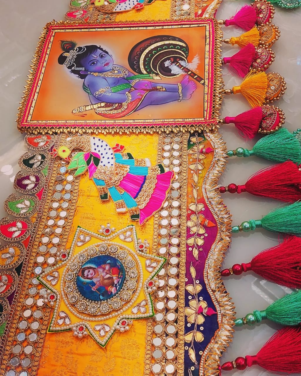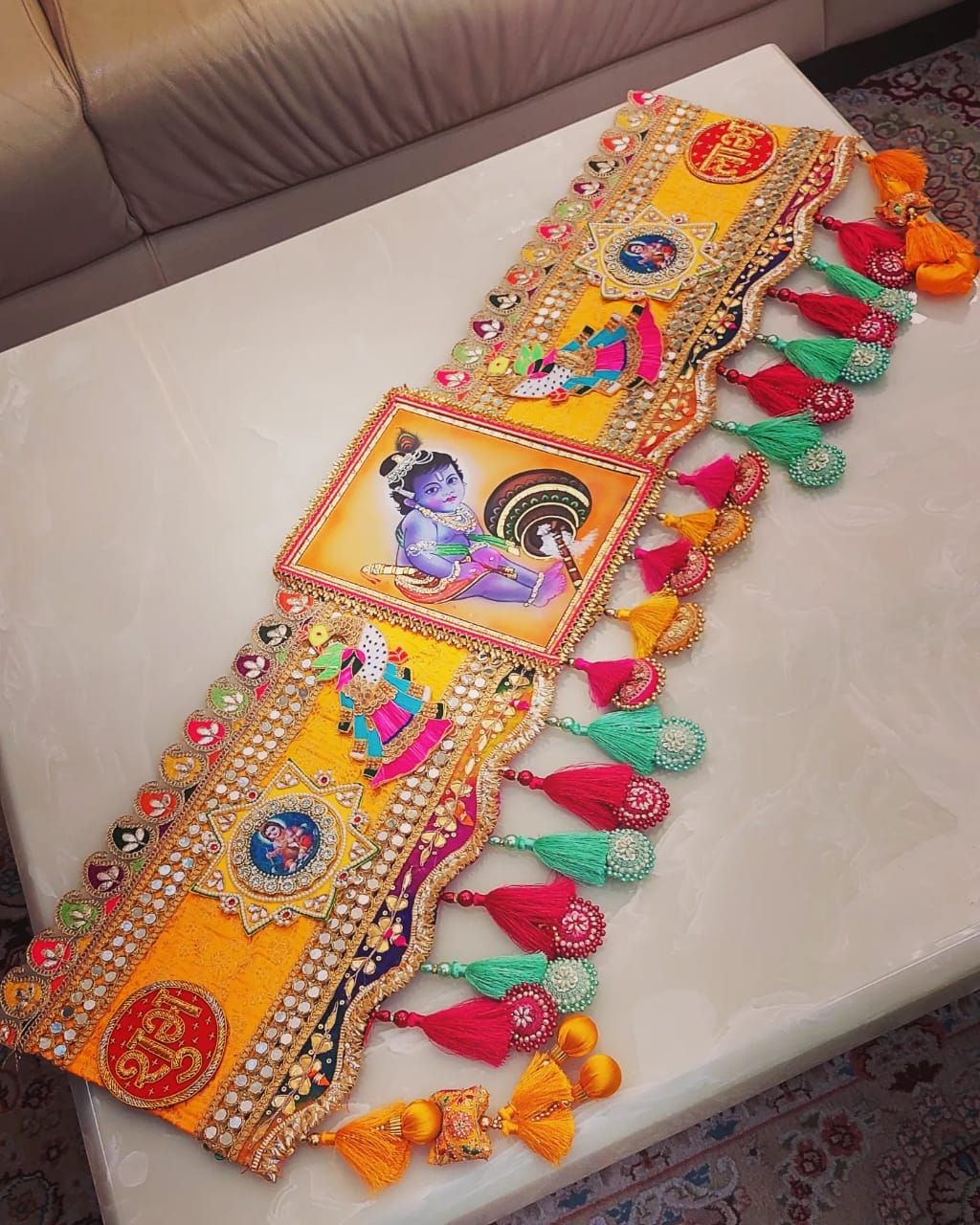 This Gorgeous Designer Toran is perfect for adding a festive touch to your doors during Janmashtami celebrations. Handmade with intricate details, it's sure to stand out and make a statement!