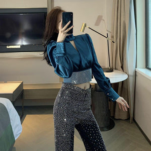 BLUE SATIN SWAROVSKI TOPS FOR WOMEN -SHOSW001B