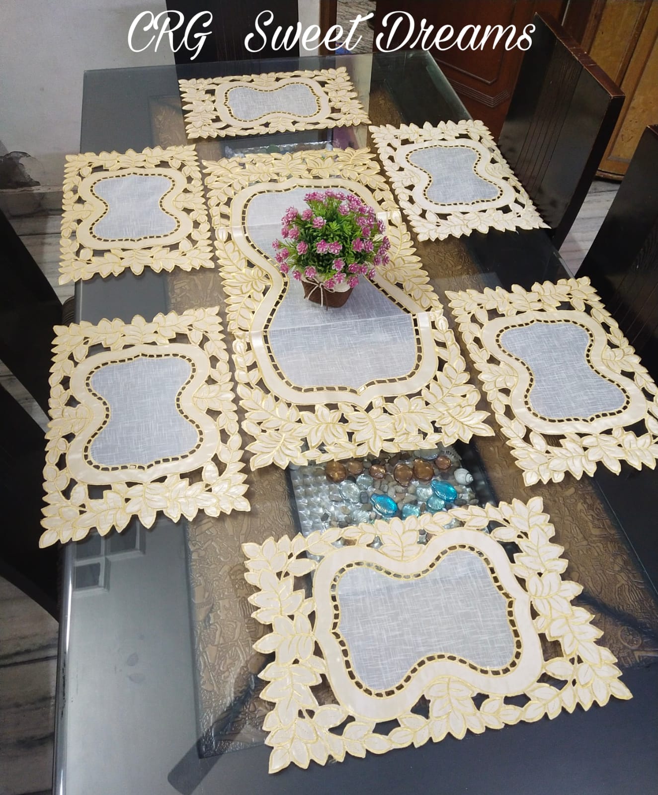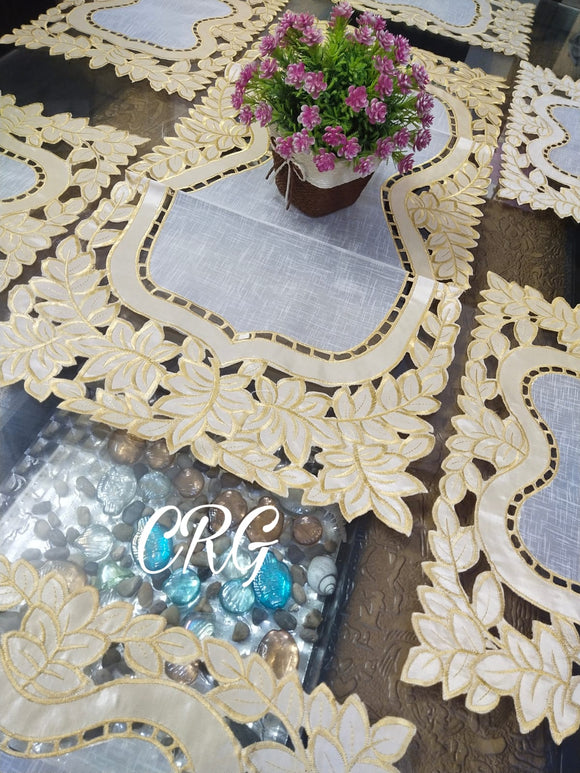 GOLDY, Combo of Beautiful Design Cut work Self Silk Embroidery Dining table Runner with Placemats-SARA001C