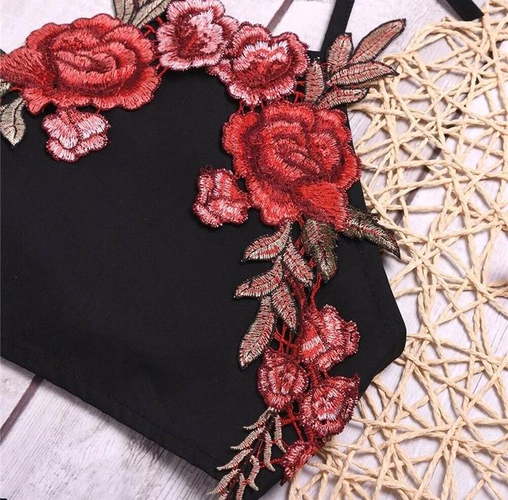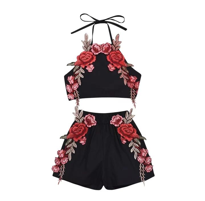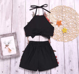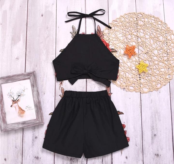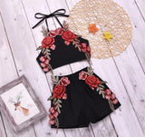 Black Halterneck top and shorts set with Red Floral Embroidery work for Girls.