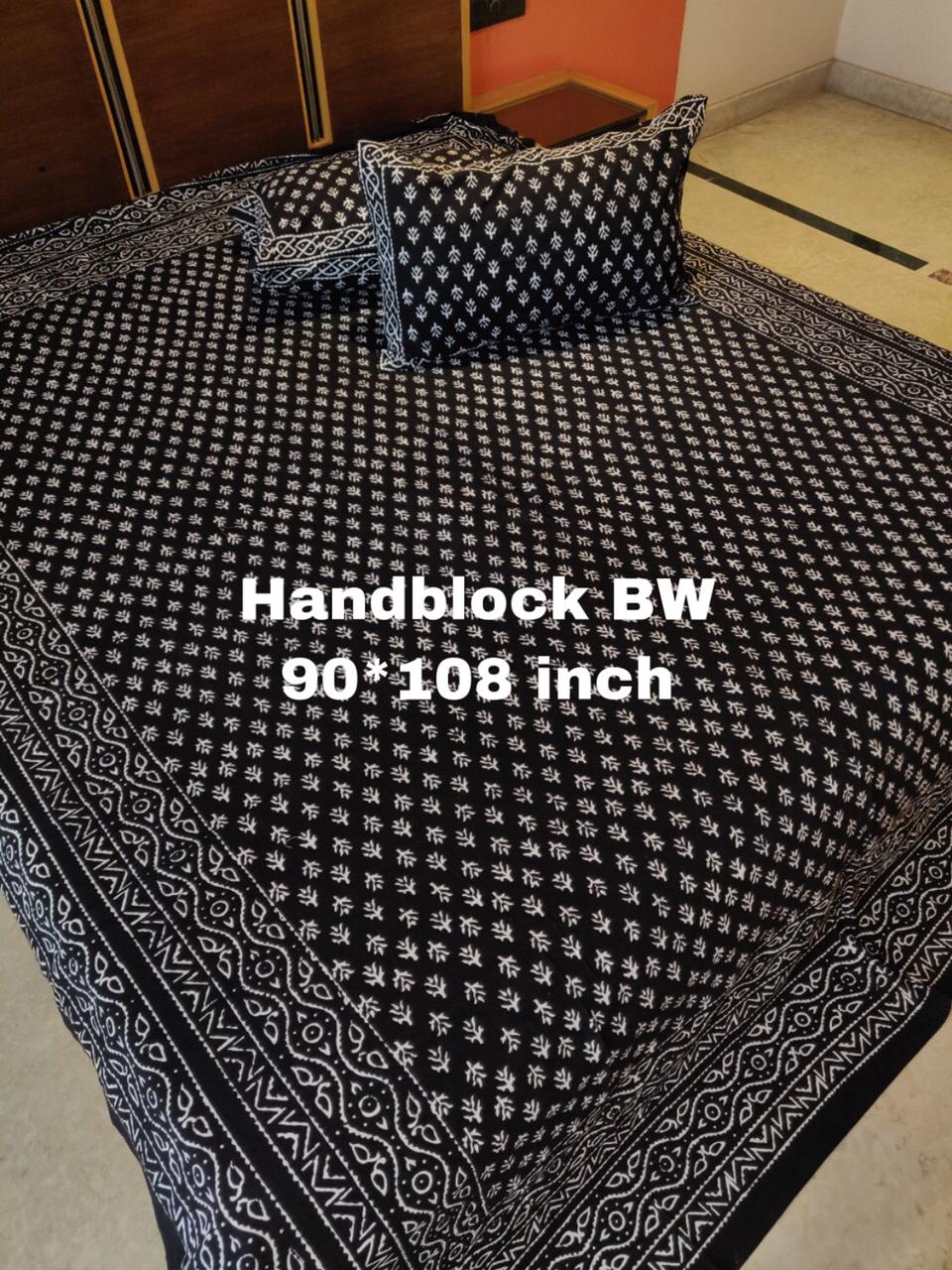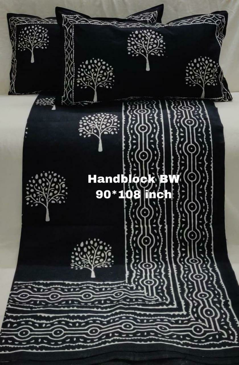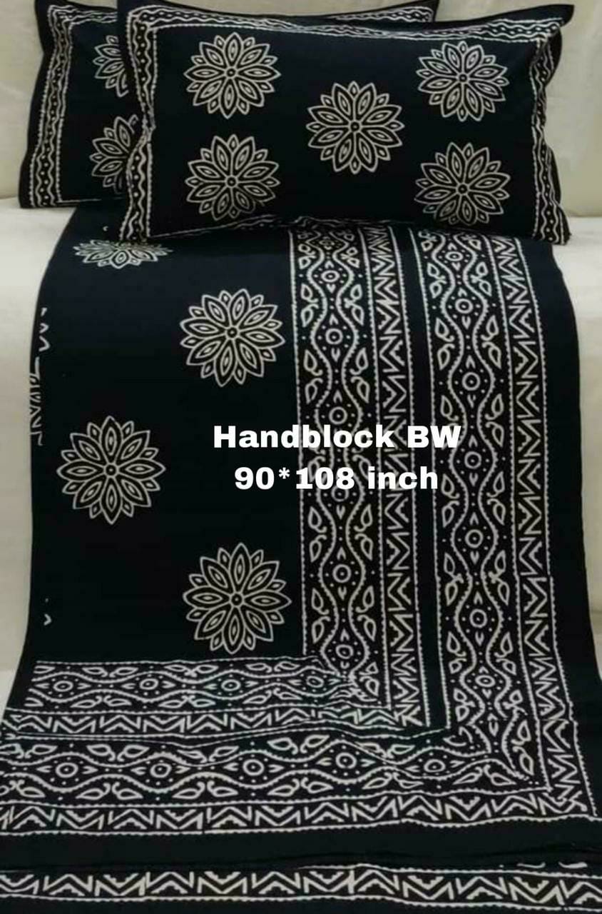 BLACK DAABU COLLECTION PURE COTTON BEDSHEET WITH PILLOW COVERS-RG35BS001B