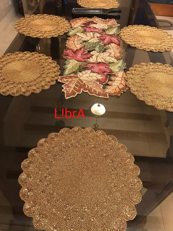 PINK MAPLES , LIBRA HANDMADE BEAD TABLE RUNNER AND 6 TABLE MATS SET -GANNTRTM001P
