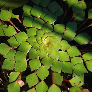 Its unique appearance is what has led to its worldwide popularity as a garden pond and bog plant. The leaves of mosaic plant whorl outward in a circular basal rosette that floats atop the water’s surface, with each diamond-shaped leaf resembling a tiny, intricate tile within a mosaic pattern. To further this likeness, when in full sun the leaves will go from being entirely green to having deeply red-tinted edges, as though painted. Some of the leaves toward the outside of the rosette may turn entirely red.
