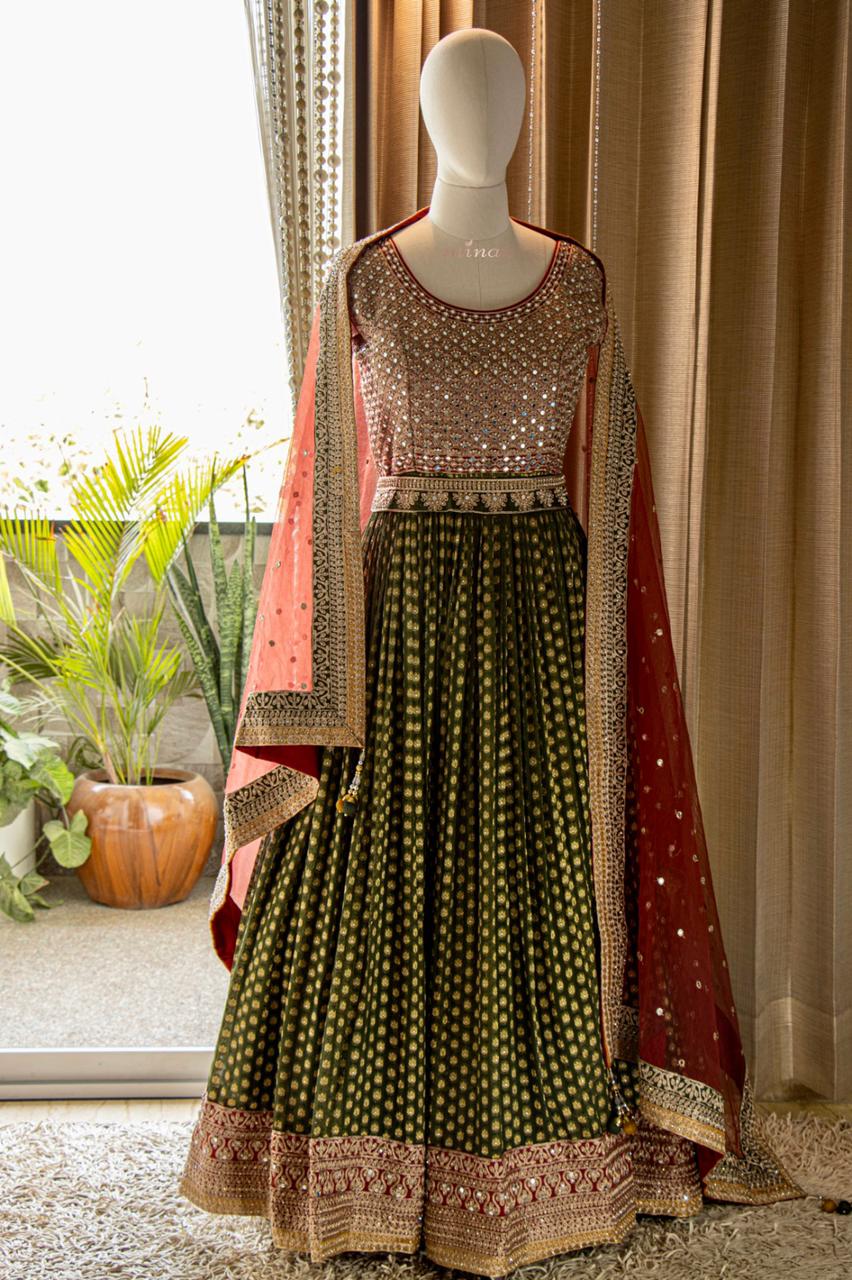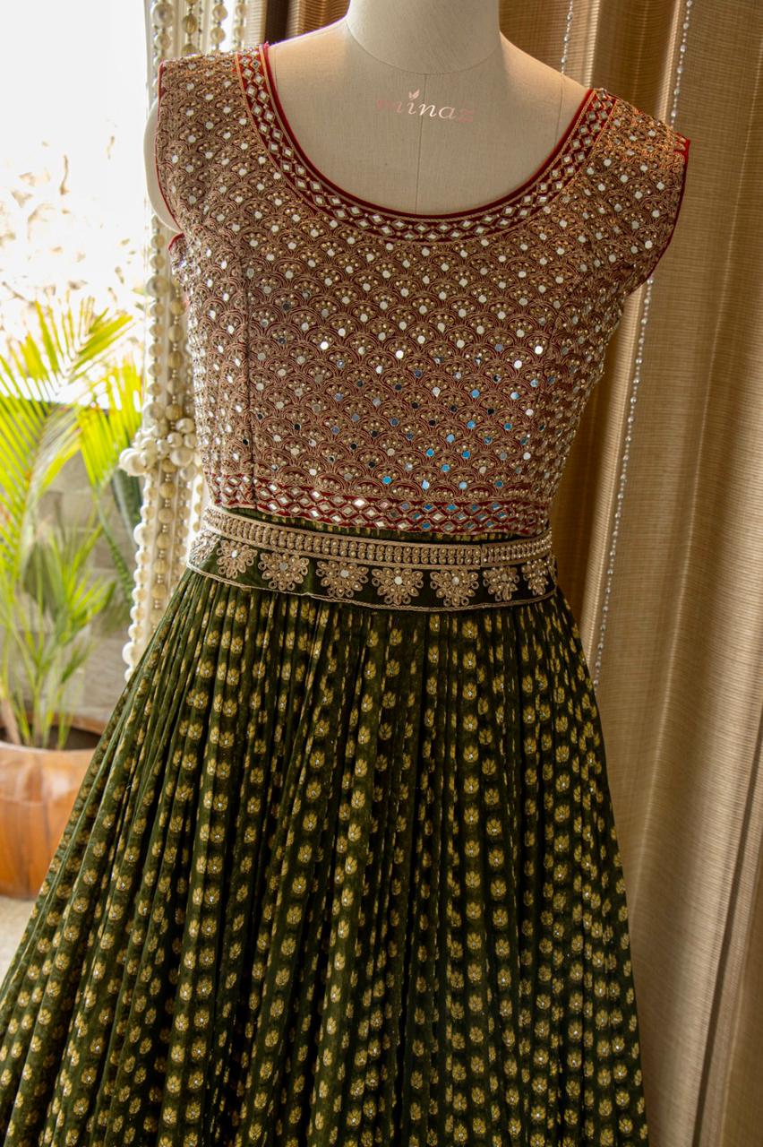 Featuring zari weaved gown heavy dori embroidery highlighted with with mirror and stone embellishment.