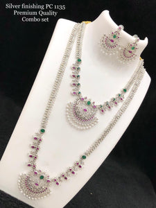 SILVER FINISH PREMIUM QUALITY LONG HAARAM/LONG NECKLACE AND SHORT NECKLACE WITH RUBIES AND PEARLS AND MATCHING EARRINGS FOR WOMEN