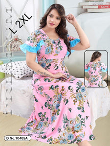 NEW IMPORTED PINK PRINTED RAYON COTTON NIGHTY WITH BLUE FRILLS FOR WOMEN -SANNW001PB