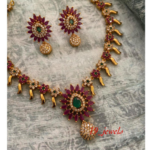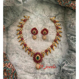 TRADITIONAL MATTE GOLD FINISH TEMPLE NECKLACE SET WITH MAROON STONES FOR WOMEN