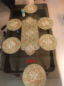 ROUND SHAPE , LIBRA HANDMADE BEAD TABLE RUNNER AND 6 TABLE MATS SET -GANNTRTM001R