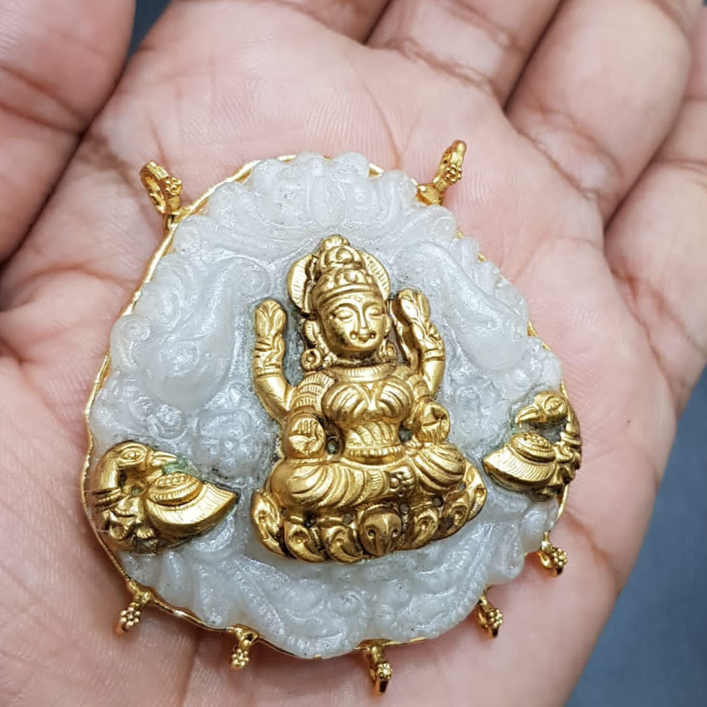 White Shade Carved Stone Statement Pendant with Goddess Lakshmi for Women