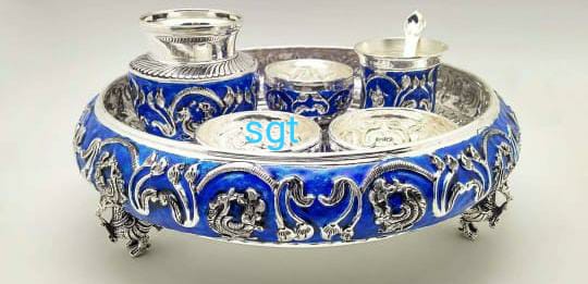 BLUE SAYANORA, ANTIQUE FINISH ENAMELLED GERMAN SILVER ANTIQUE POOJA SET-SNEPS001B
