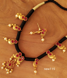 Thread Necklace with embellishments and matching earrings for todays fashionable ethnic look .
