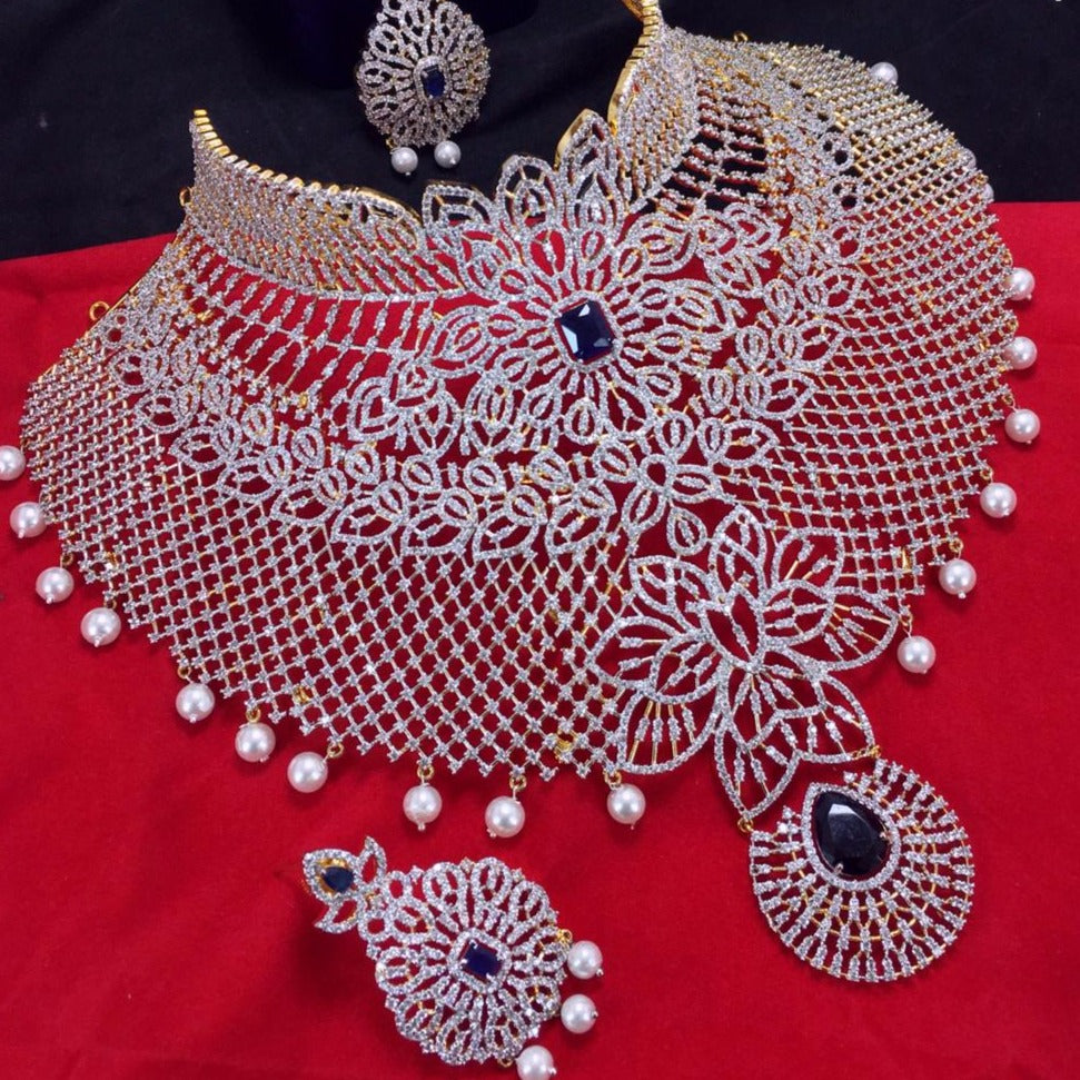 American Diamond Necklace Set with Blue stones and American diamonds and Pearls with intricate Floral Design makes it a perfect piece of Art!!