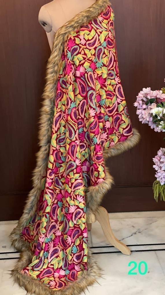 VIOLETS , Woolen Heavy embroidered stole with four side fur edges-MOE001C