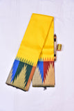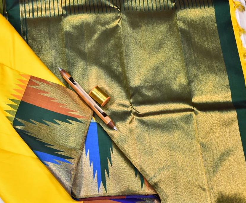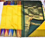A traditional handwoven kanchipuram pure silk saree in bright Yellow with Dark Green Korvai Borders on both sides of the saree body. The Rich Gold zari on pallu has gold zari work in traditional designs while the Dark Green temple korvai border has horizontal golden lines which add beauty to the saree