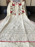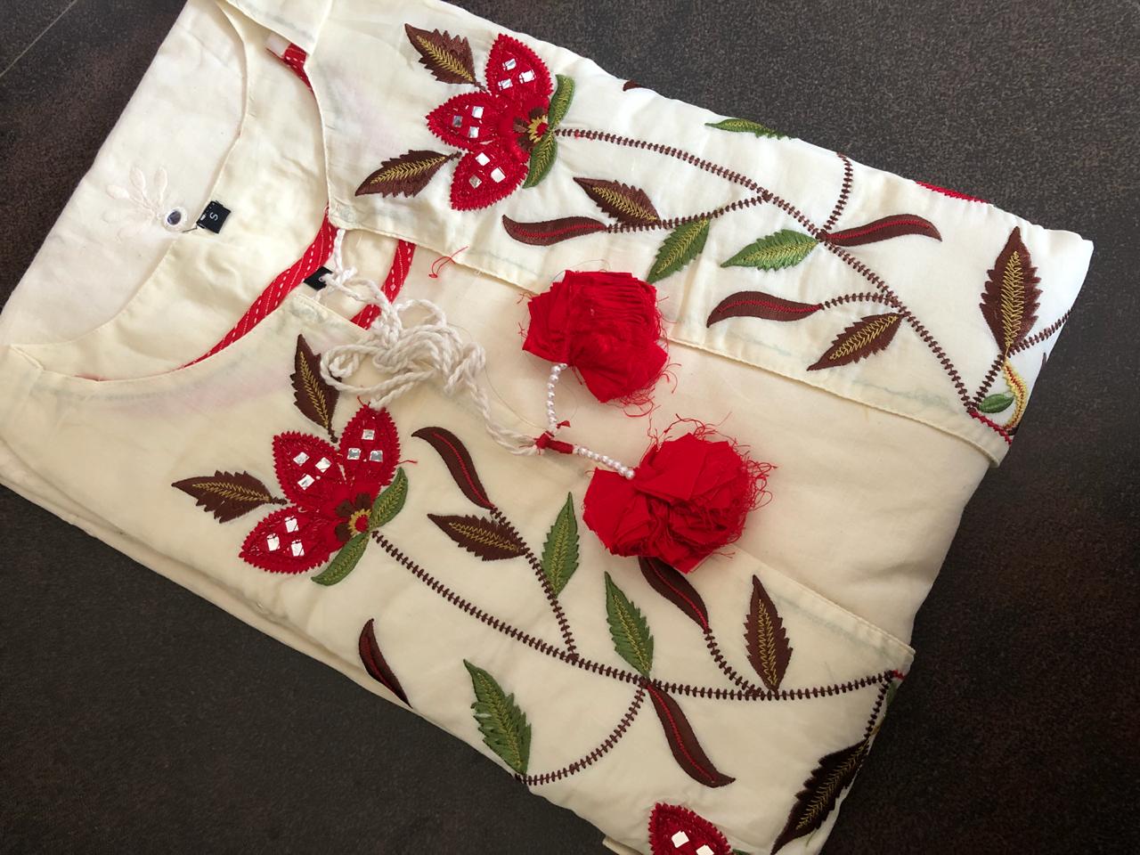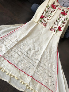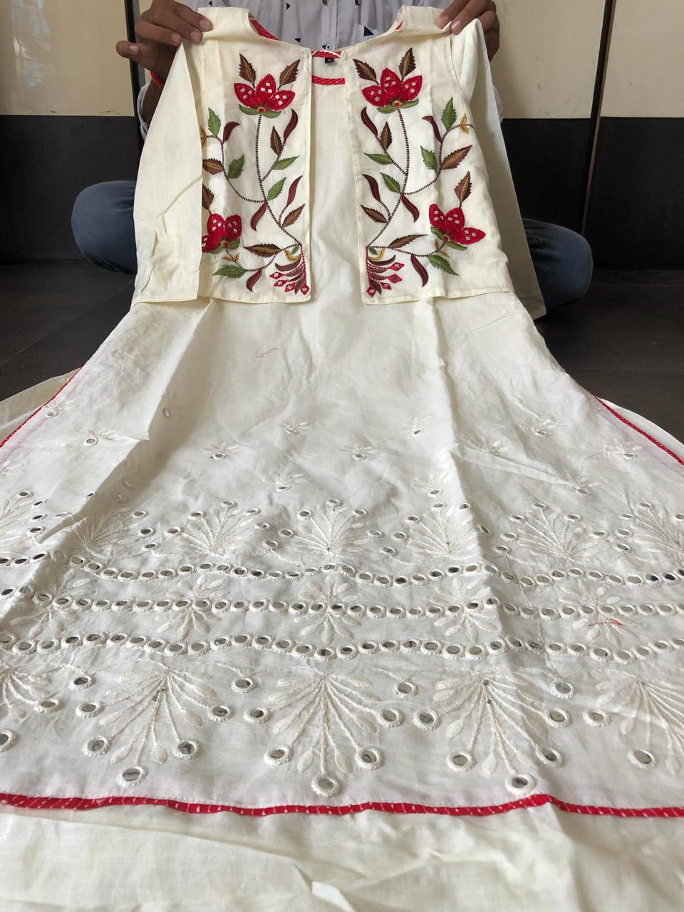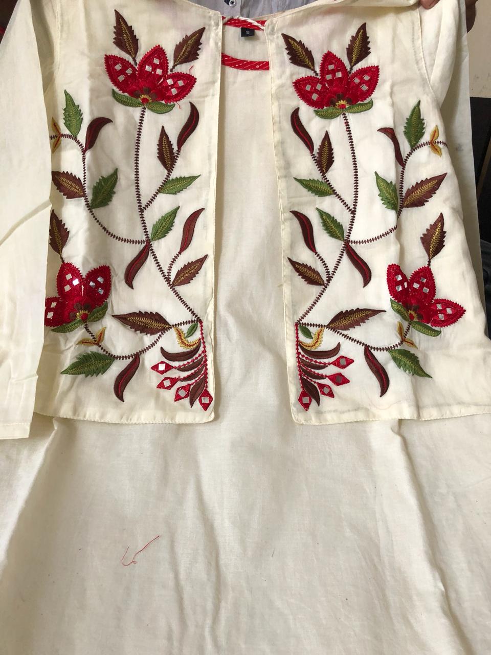 Premium cotton double layer jacket style one piece dresss with beautiful embroidery and foil mirror on yoke and all over the kurta embellished with embroidery... with pom pom lace and beautiful tassels..Available in sizes : 38 ,40,42, 44