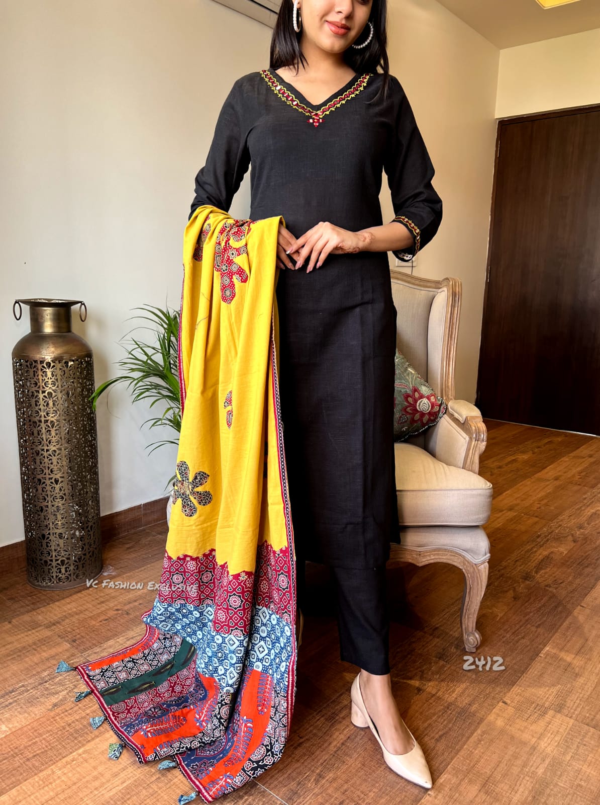 This season turn your everyday into special and strengthen your our south cotton black dress with "Vc Fashion". An eyeful beauty *Applique cotton hand made duppatta