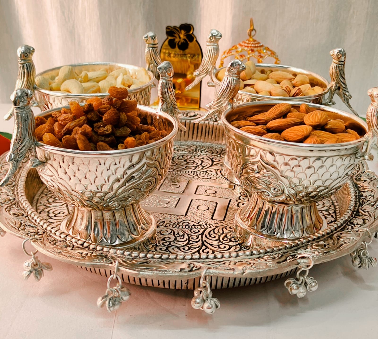 German silver antique 4 parrot bowl with plate-GRIH001GSP