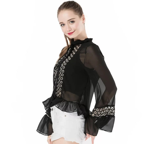 2019 Spring Autumn Neploe Lace Up Metal Ring Hollow Out Ruffle chiffon top*