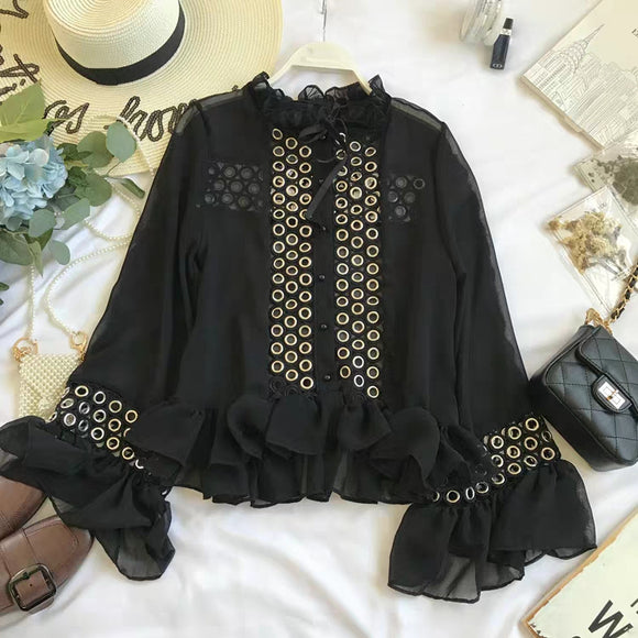 2019 Spring Autumn Neploe Lace Up Metal Ring Hollow Out Ruffle chiffon top*